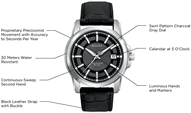 The collection masterfully combines unparalleled accuracy to seconds per year, continuous-sweep second hand and intricate details for timeless style. In stainless steel with multiple-layer swirl-pattern charcoal gray dial, silver continuously sweeping second hand, luminous hour and minute hands, faceted stick markers with luminous squares, calendar, and black leather strap. Powered by Bulova s proprietary three-prong quartz crystal movement with a 262kHz vibrational frequency.