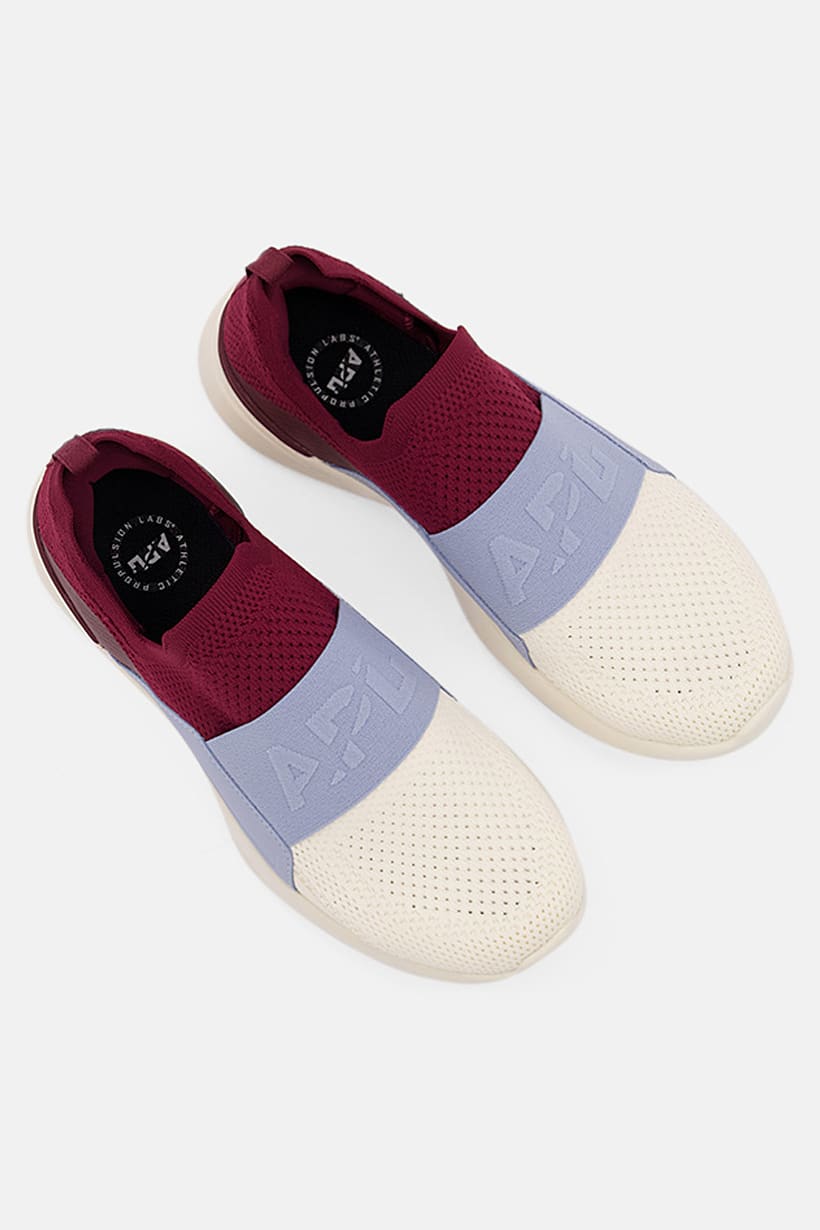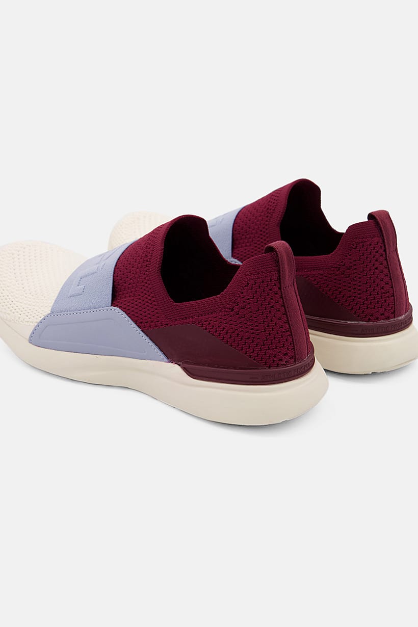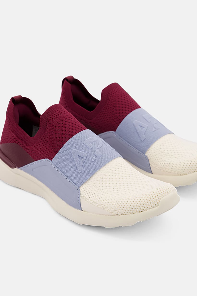 Burgundy, blue and white slip-on running shoes for women with Techloom Bliss technology.