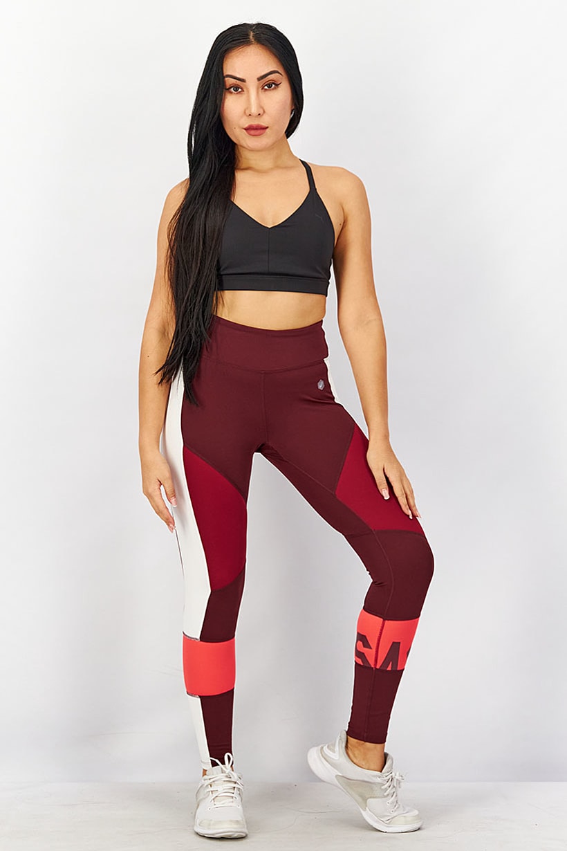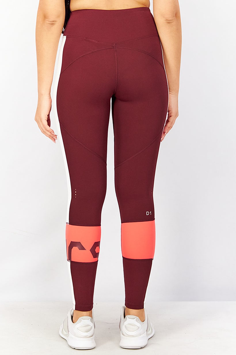 Burgundy Combo High-Waist Sport Leggings with Brand Logo for Women.