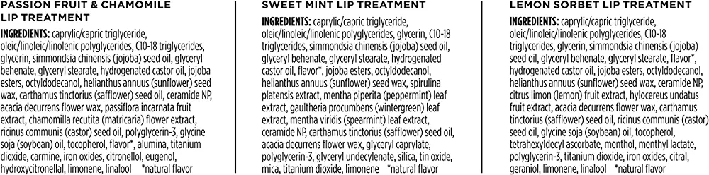 | descriptionOriginal | Description Include healthier-looking lips intensely moistened for up to 8 hours into your lip care routine with the Burts Bees Lip Treatment Mask Variety Pack. This lip mask pack includes Sweet Mint Lip Treatment Mask, Lemon Sorbet Lip Treatment Mask and the Intensive Lip Treatment Overnight Lip Mask. The Sweet Mint Lip Treatment Mask is enriched with soothing sea minerals plus naturally-derived mica for a hint of shine with a gentle tingle, while the Lemon Sorbet Lip Treatment Mask is infused with antioxidant-rich Vitamin C to revive and nourish lips and leaves behind a mood-enhancing, zesty flavor. Burts Bees Intensive Lip Mask Overnight Treatment is infused with Passion Fruit and Chamomile Extract to leave lips feeling supple, smooth and soft. All three lip masks are formulated with ceramides and work to reduce the look of fine lines on and around your lips while you sleep. The 100% natural origin formulas are formulated without parabens, phthalates, SLS or petrolatum for natural, clean lip therapy. Burts Bees also uses jars that are recyclable with Terracycle, cartons made from 100% recyclable paperboard and has Landfill Free Operations and a CarbonNeutral Certification. |