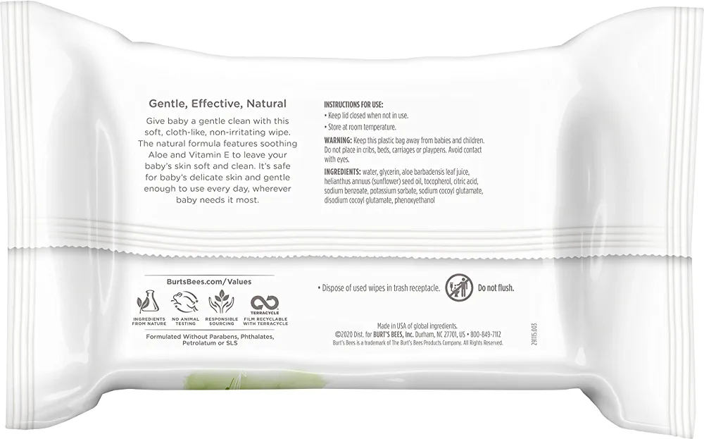 | descriptionOriginal | Description Mamas asked. Nature heard. Meet Burt's Bees Baby Wipes that are made to help soothe and cleanse babys sensitive skin with natural, non-irritating ingredients. These cloth-like, fragrance-free wipes for babies are lovingly infused with Aloe and vitamin E, which is gentle for everyday use on faces or bottoms. We use Aloe Vera in many of our products because it is a great moisturizer that helps soothe dry skin. The cloth-like texture has a soft hand feel for a non-irritating clean on delicate skin. Accepted by the National Eczema Association and pediatrician tested, these 99.2% natural origin baby wipes are fragrance free and formulated without additives such as synthetic fragrances, parabens, phthalates, or petrolatum. The perfect addition to any diaper bag, baby shower gift or new baby gift Set, these unscented baby wipes are always smart to have on hand. Nurture baby's skin naturally with Burt's Bees Baby Wipes. |