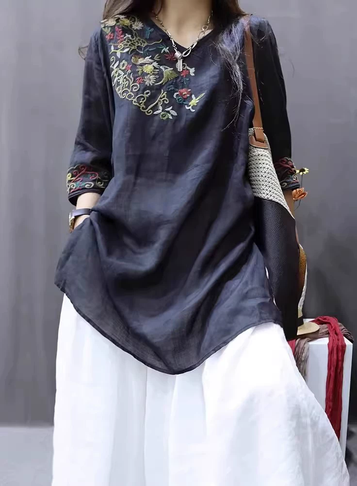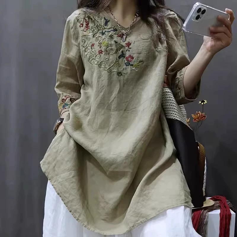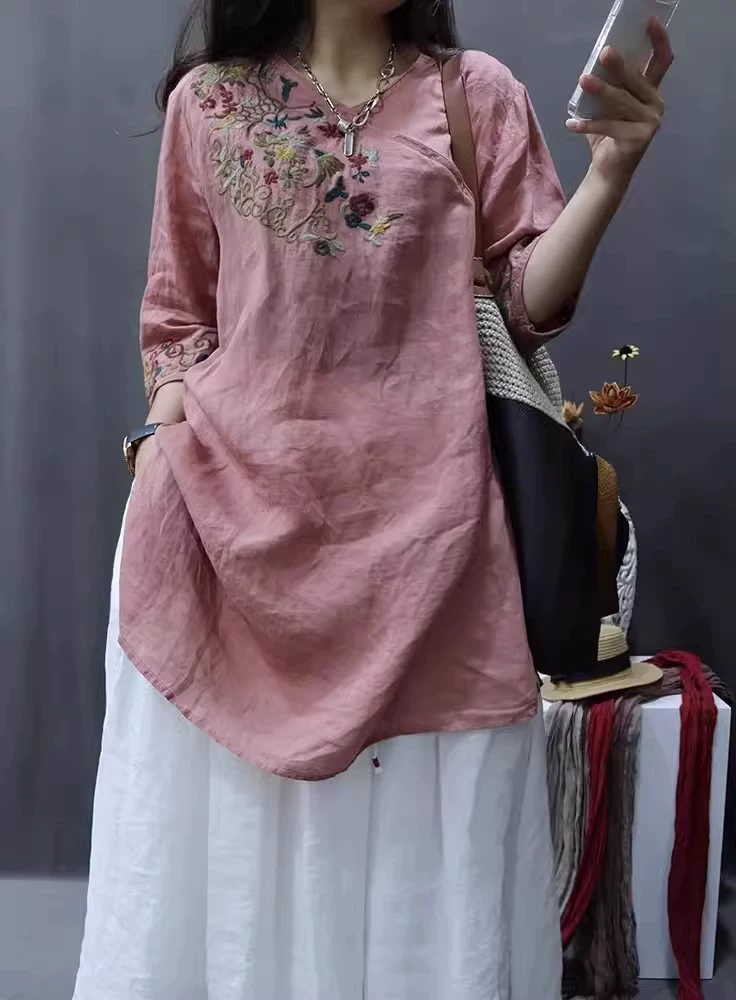 Butt-covering shirt, ramie embroidered slim and loose T-shirt