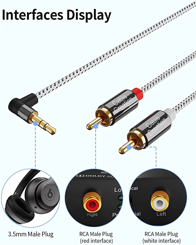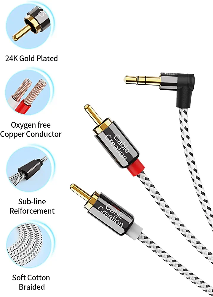 | nameOriginal | 3.5mm to RCA Cable,CableCreation 10 Feet Angle 3.5mm Male to 2RCA Male Auxiliary Stereo Audio Y Splitter Gold-Plated for Smartphones, MP3, Tablets, Speakers,Home Theater,HDTV,3m |