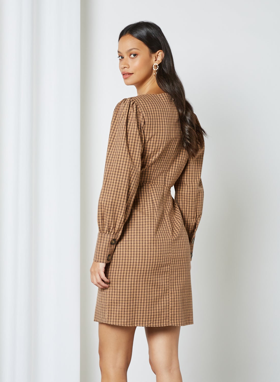 Achieve a chic appearance by pairing this dress with boots. It features a square neckline and long sleeves, as well as an all-over checked pattern. The front button detail adds a touch of elegance, while the concealed back zipper closure ensures a secure fit. This dress has a mini length and is made of 65% cotton and 25% polyester. To maintain its quality, wash it according to the care label instructions. The model is 178cm tall and wears size 34.