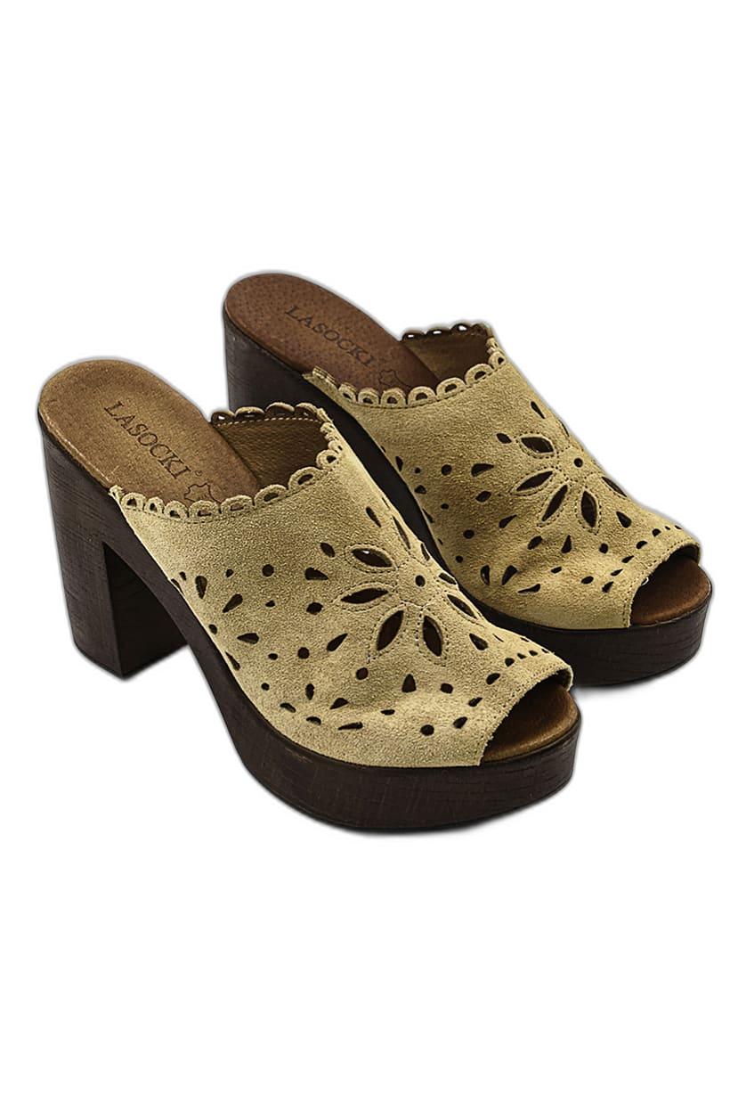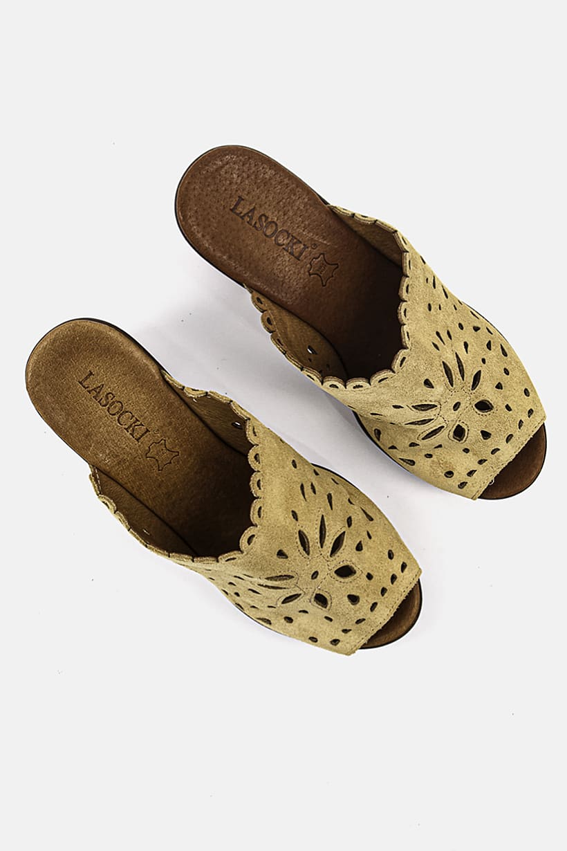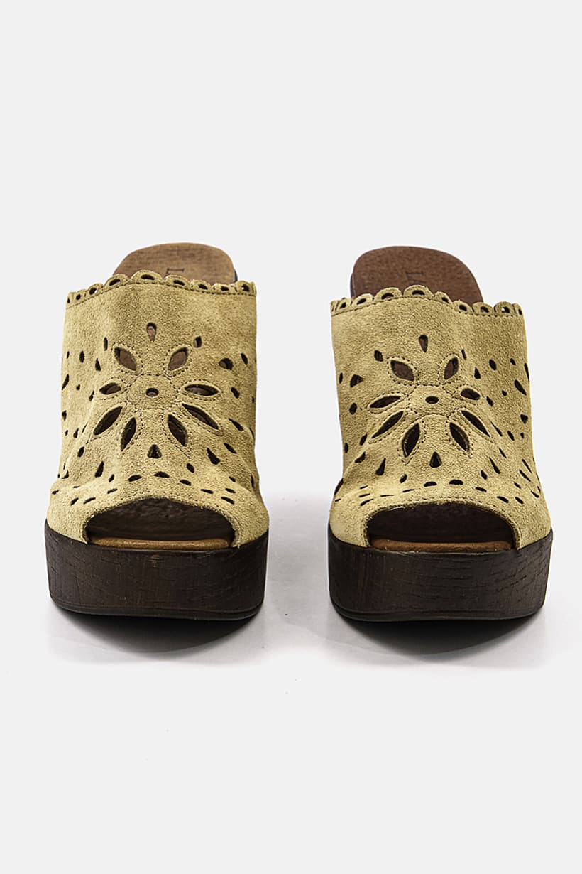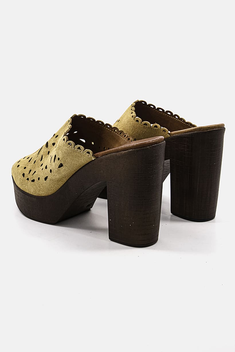 Heel Height : 5" / 12.7 cm, Heel Style : Block heel, Ideal For : Women, Shoe Closure : Slip on, Sole Material : Wooden Sole, Toe Style : Open toe, Disclaimer : Product color may slightly vary due to photographic lighting sources or your monitor settings., Occasion : Casual, Pattern & Print : Eyelet, Shoe Material : Suede , Color Family : Brown,