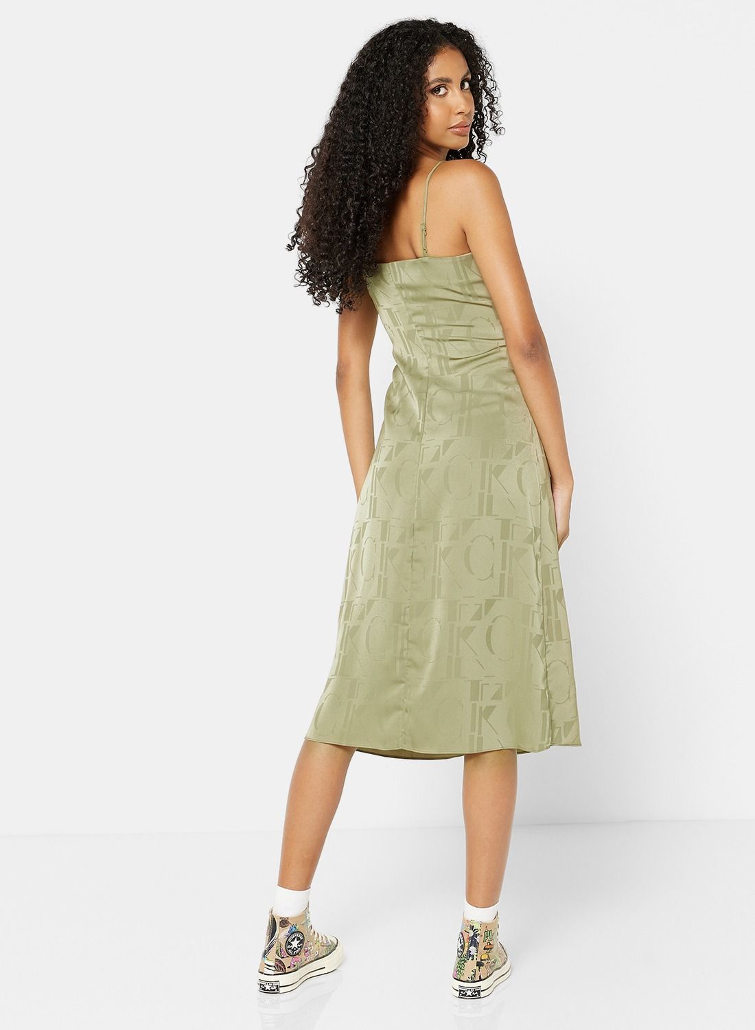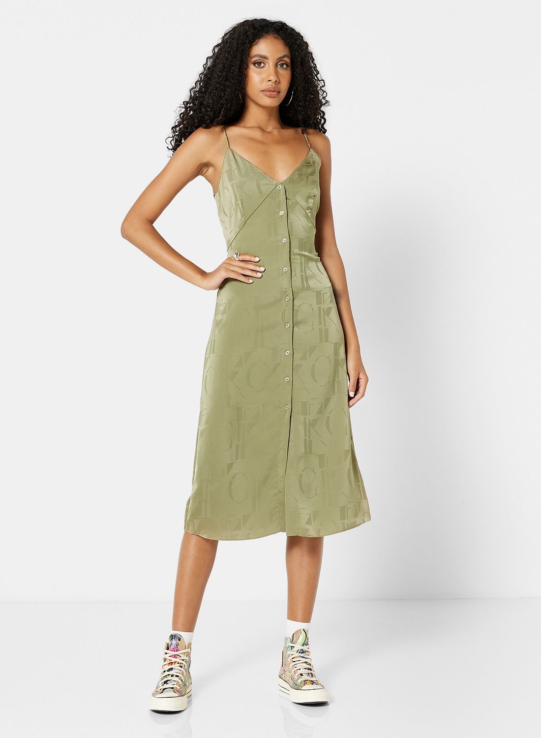 This product features a smooth and luxurious polyester material that resembles silk. It has a flattering V-neckline and slender shoulder straps. The front is secured with buttons for added security. The fit is regular and falls to a midi length. Please follow the care label instructions when washing. The Calvin Klein Jeans logo is prominently displayed. The model is approximately 180 cm tall and is wearing a size S.