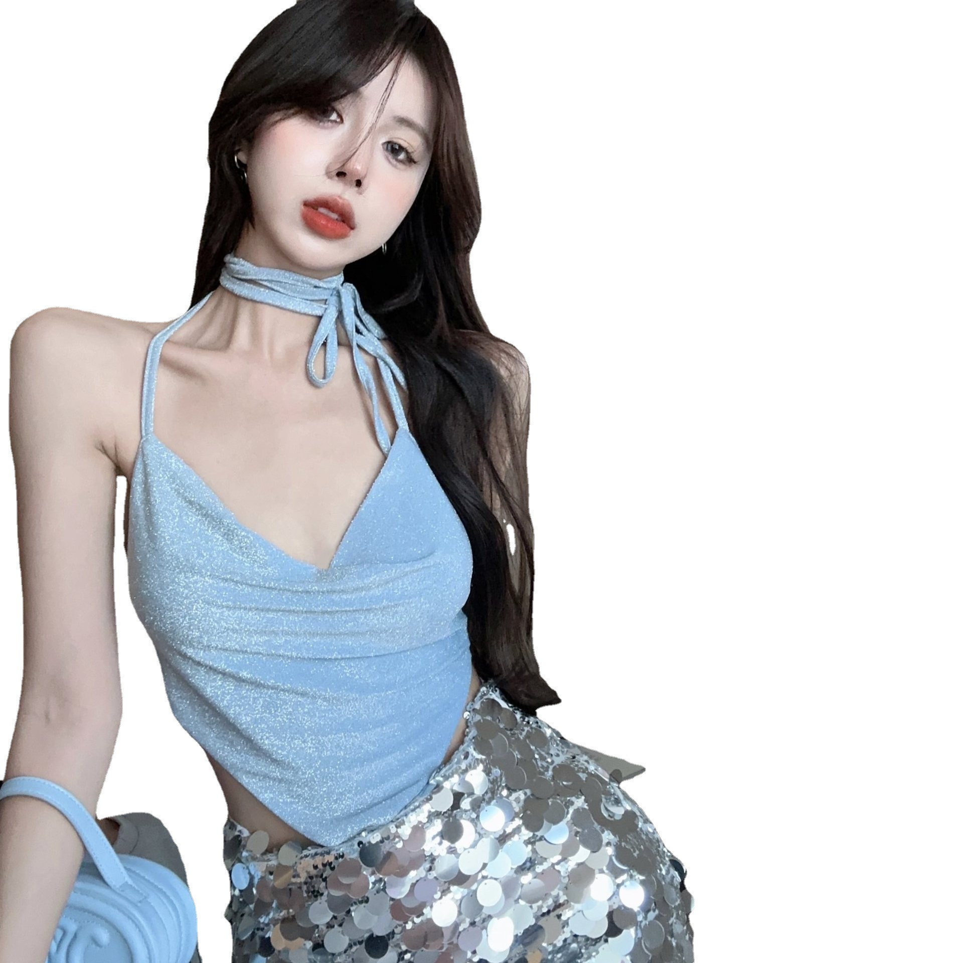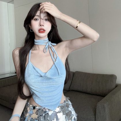 Camisole Women’s French Style Lace-up Neck Hanging Cunchy Machine Design Autumn New Blue Irregular Short Top
