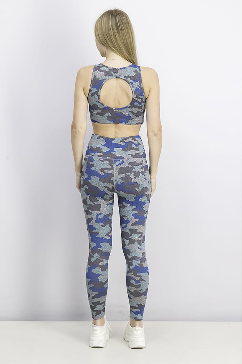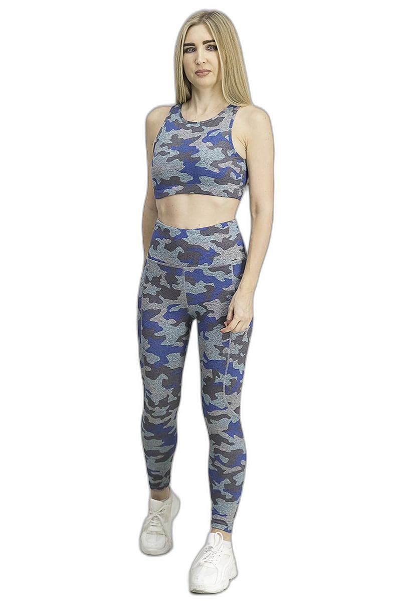 Camo Blue Sleeveless Top and Leggings Set with Padding for Women.
