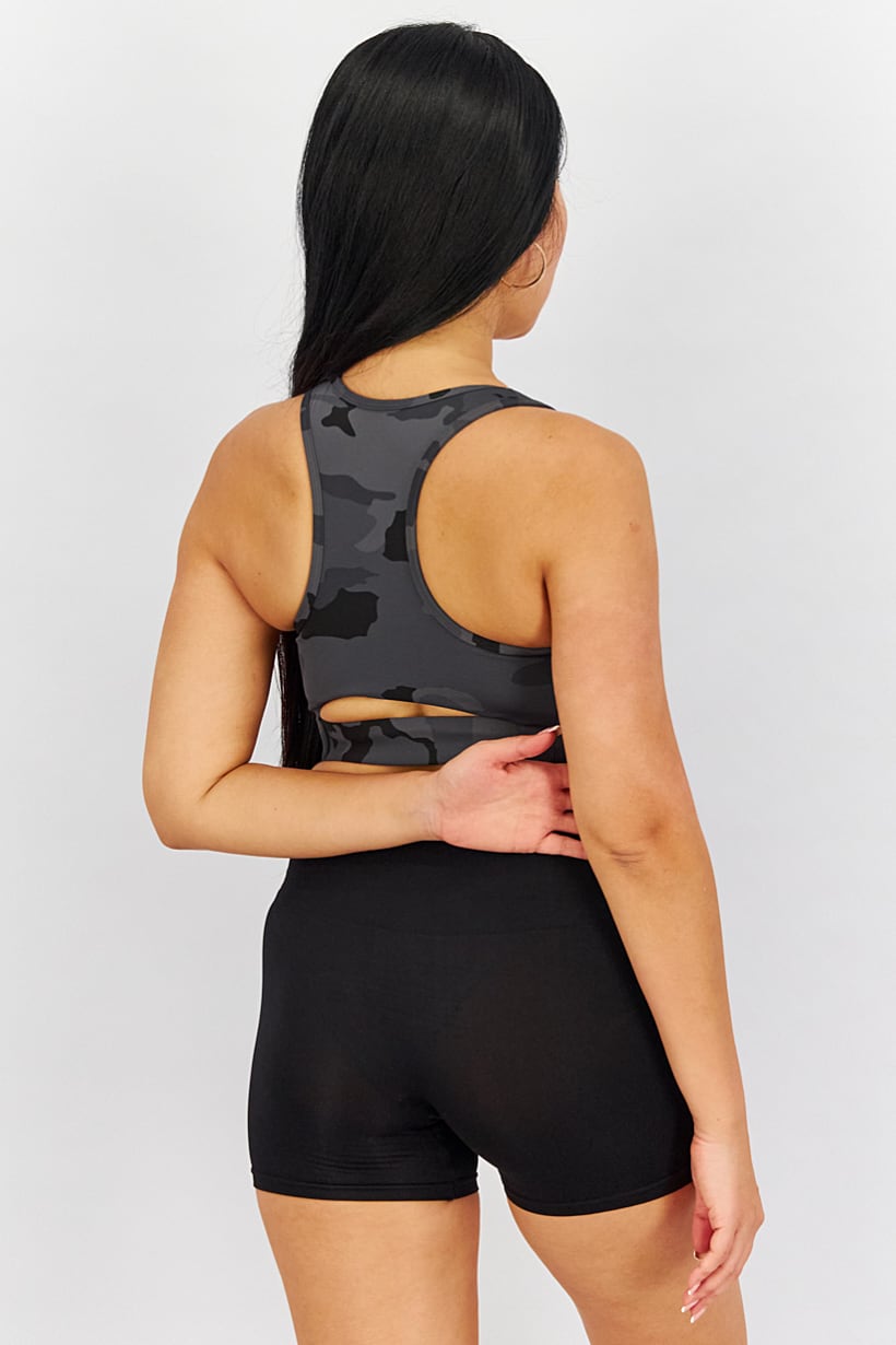 Care : Machine washable, Fit : Sportswear Fit, Ideal For : Women, Padding : Yes, Size shown : International, Sleeve Length : Sleeveless, Thickness : Light, Type of Sport : Training, Types of Hem : Straight hem, Types of Neckline & Collar : Scoop neckline, Types of Sleeve : Sleeveless, Disclaimer : No returns accepted on lingerie, socks, undergarments and swimwear due to hygiene reasons., Fabrics : 80% Polyester, 20% Elastane, Occasion : Sport, Pattern & Print : Camouflage, Sportswear Type : Sports Bra, Types of Closures : Pullover, Color Family : Grey,