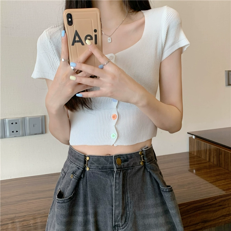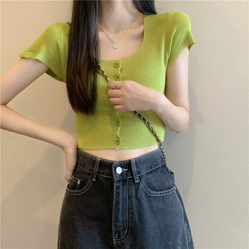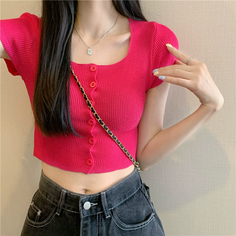 | nameOriginal | Candy color square neck single breasted navel exposed knitted short sleeves |