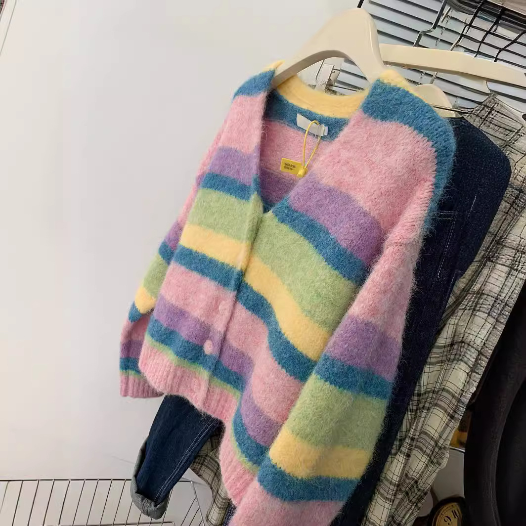 | nameOriginal | Candy Color V-neck Rainbow Striped Raccoon Velvet Sweater Jacket Women's Autumn and Winter Colorful Outer Wear Short Knitted Cardigan |