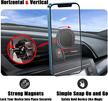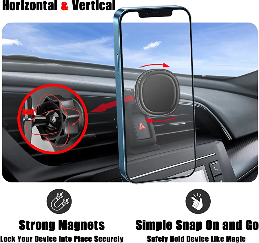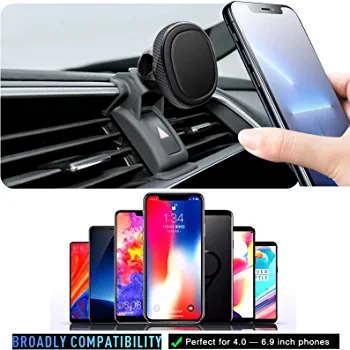 The mount offers 360° rotation and securely holds your phone in both landscape and portrait orientations. It has a strong suction and can be tilted and rotated to control the vents. The mount is compatible with mobile phones ranging from 3 to 7 inches.