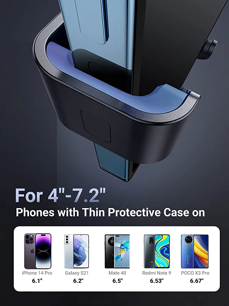 Drive safely with UGREEN’s air vent car mobile holder, which allows you to view navigation without blocking your sight. The gravity linkage design ensures a stable triangle structure that securely holds your phone, even on bumpy roads. The soft silicone pads protect your phone from scratches. This holder is case-friendly and compatible with phones up to 7.2 inches, including iPhone, Galaxy, Huawei, Xiaomi, and other smartphones. Choose from three different positions: air vent, dashboard, or dashboard car holder.