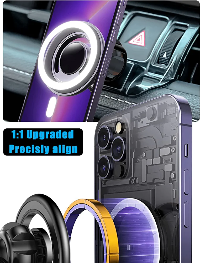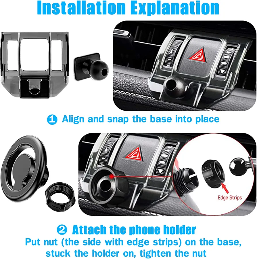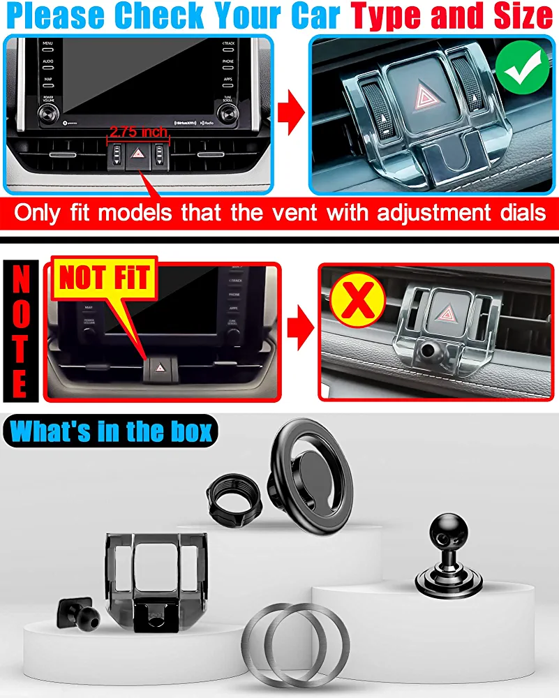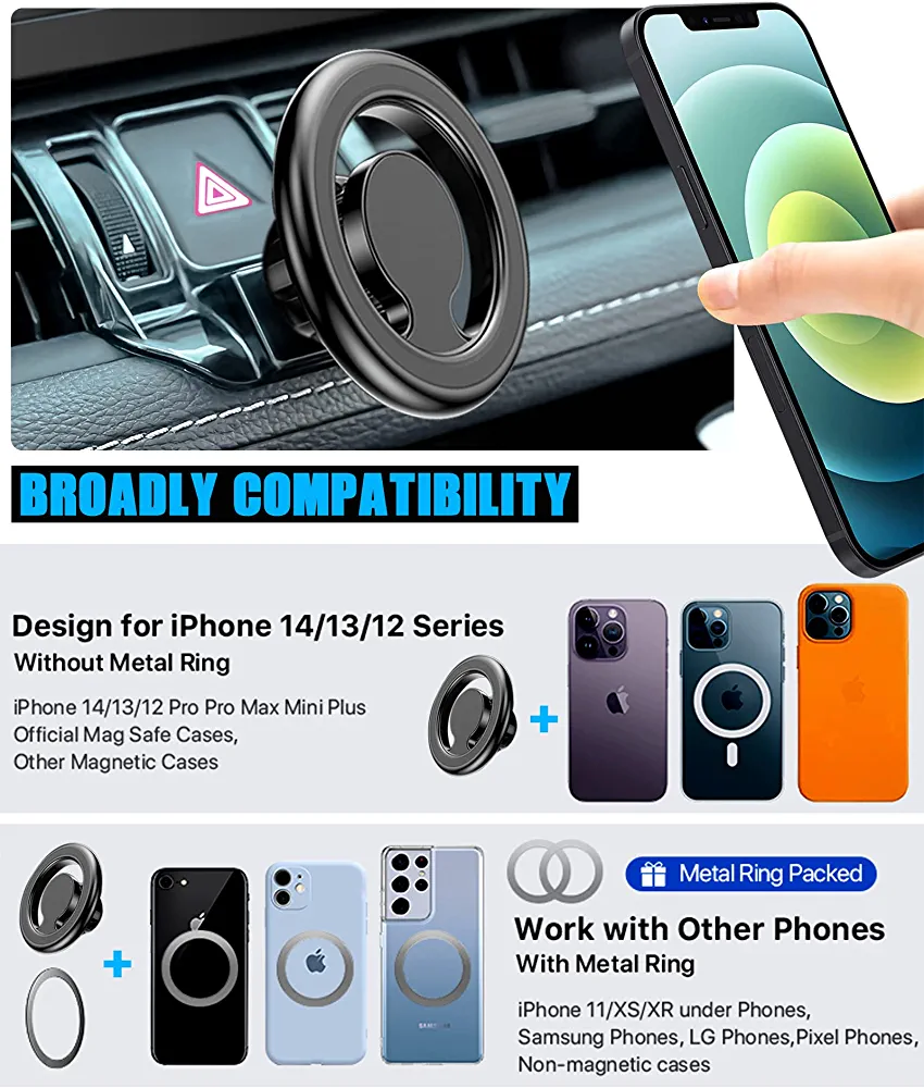 This magnetic car phone mount is designed specifically for iPhone 14/13/12 series phones and can hold them directly. It is also compatible with Original Official MagSafe cases and other brands’ built-in MagSafe cases, eliminating the need for additional magnet plates. The magnetic phone holder is custom-made for the Toyota RAV4 and is an excellent solution for mounting your phone securely and conveniently. It snaps into place without the need for adhesive or suction cups and does not interfere with your phone’s signal. The magnet cell phone car mount is compatible with all phones and cases and comes with two extra metal rings as gifts. The hollowed-out ring design of the magnet cell phone holder for car does not block the wireless charging function. The phone holder is easy to install and adjust, and it provides a good view while driving. It rotates 360 degrees and can hold your phone securely in both landscape and portrait modes. It is a one-hand operation design, allowing you to free your hands while driving.