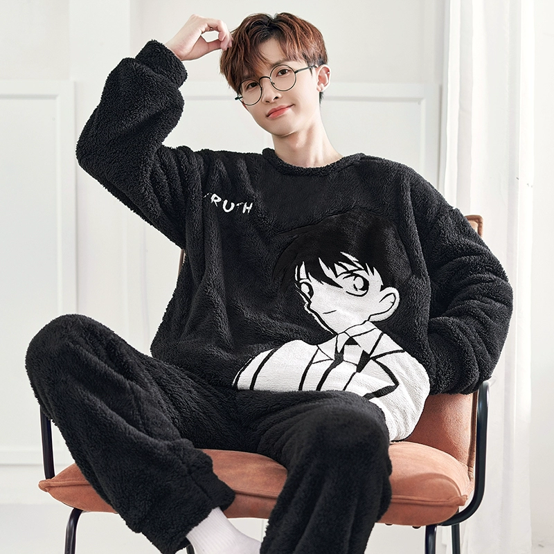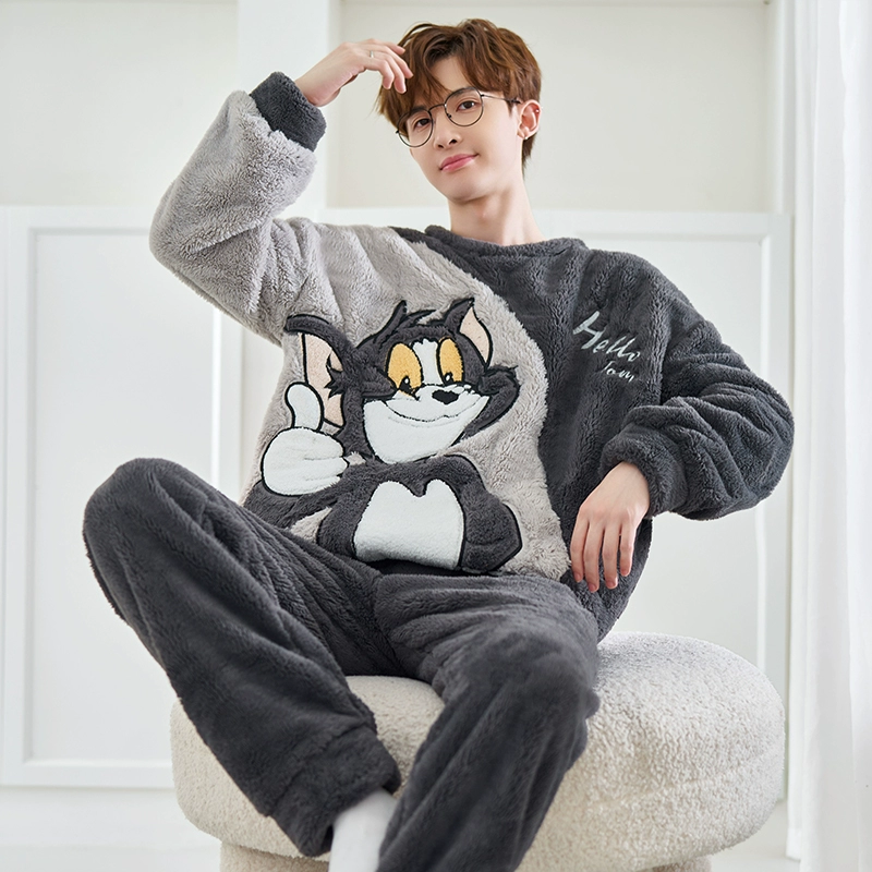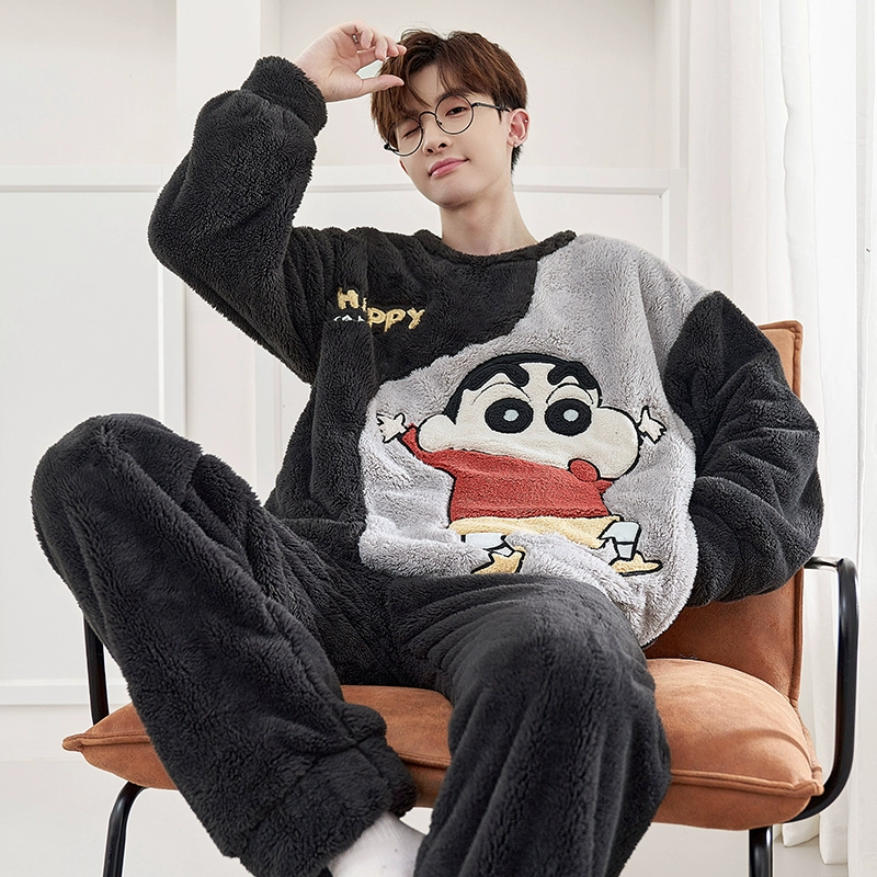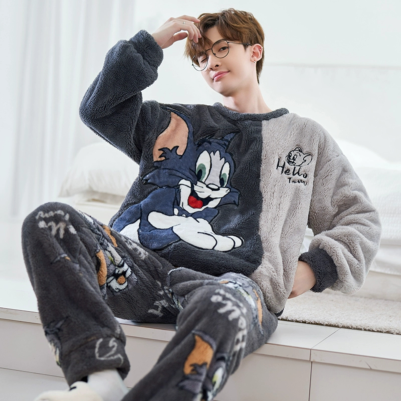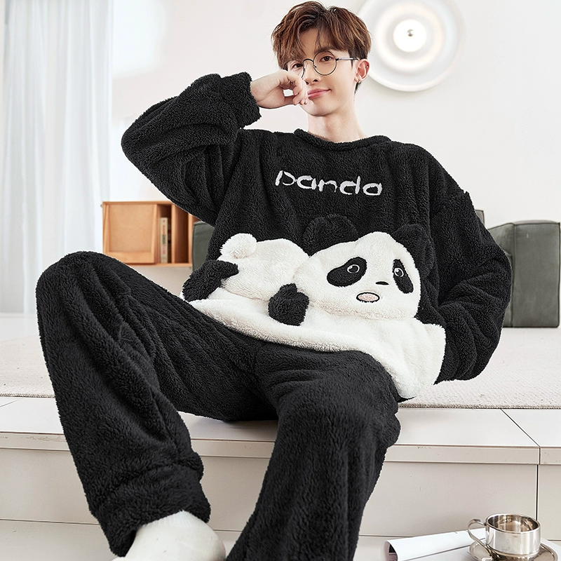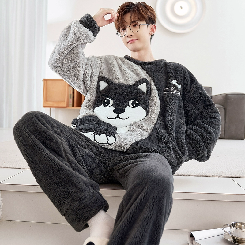 Cartoon cute pajamas for men in autumn and winter flannel thickened plus velvet large size coral velvet can be worn outside home clothes set