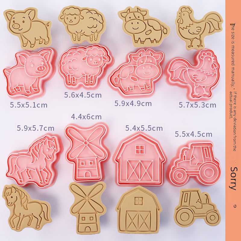 | nameOriginal | Cartoon Farm Animal Biscuit Mold Cow Chick Pig Horse Sheep 3d Fondant Baking Cookie Cutting Tool |