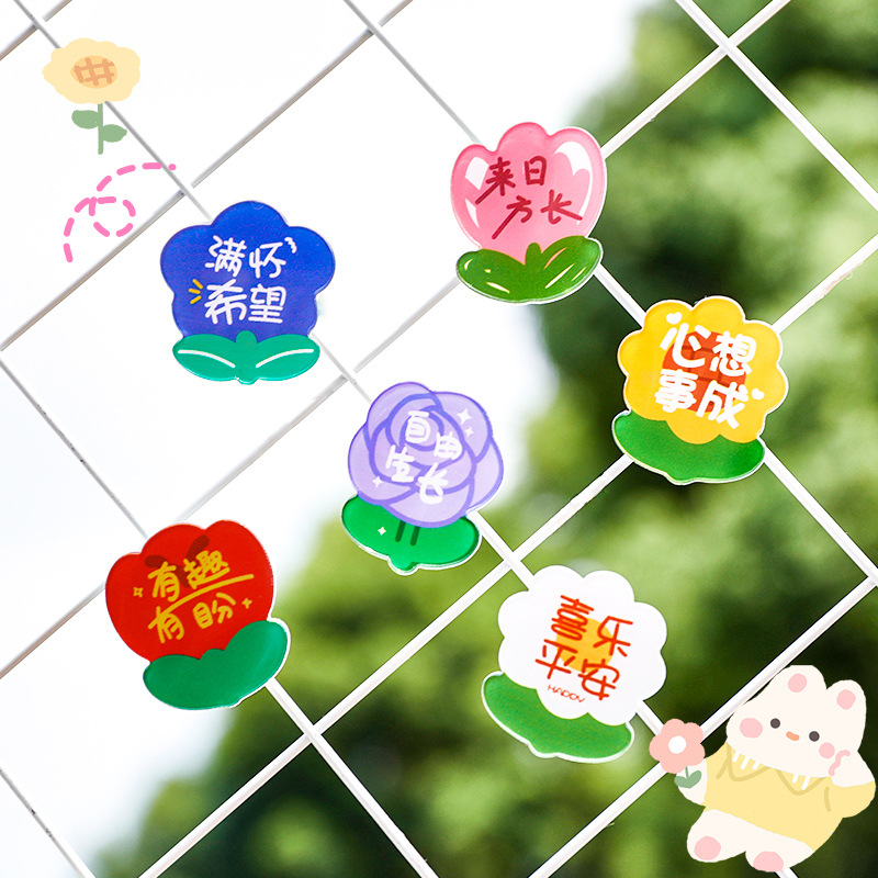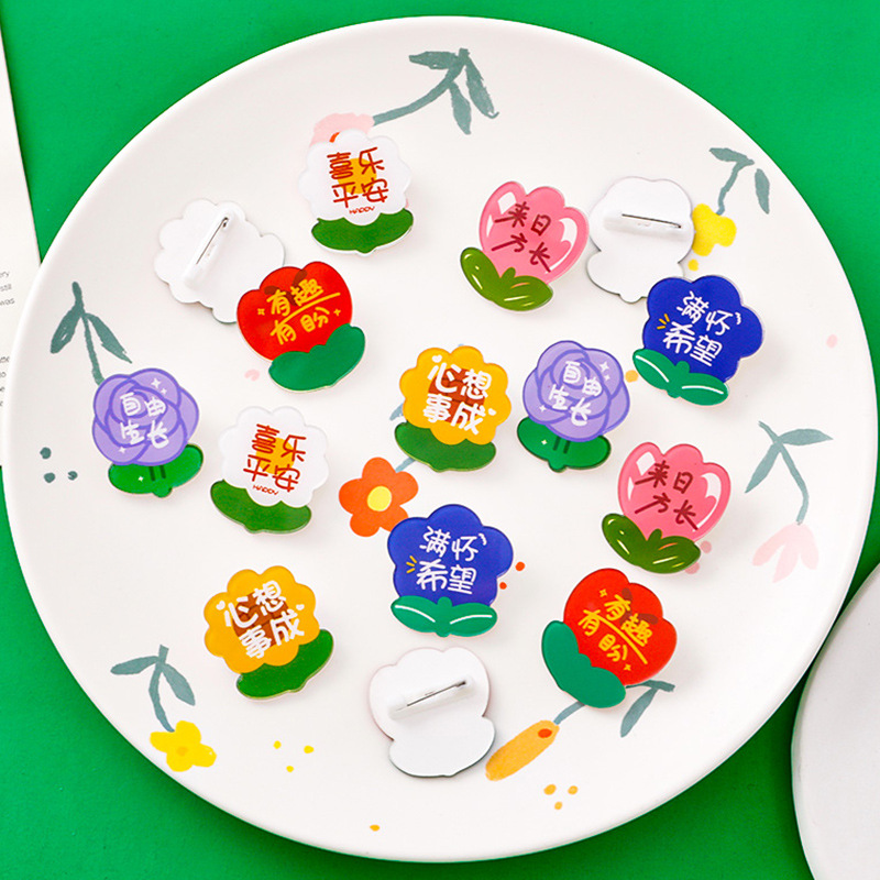 | nameOriginal | Cartoon special-shaped flower brooch children's inspirational text accessories pin primary school student prize gift acrylic badge |