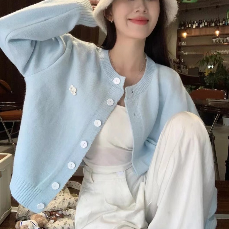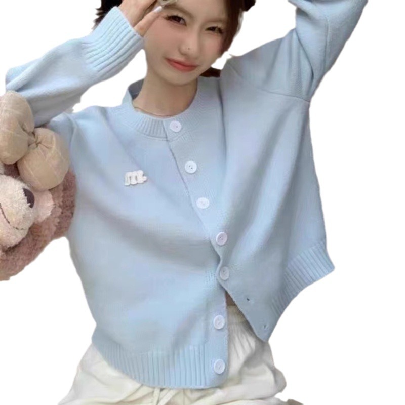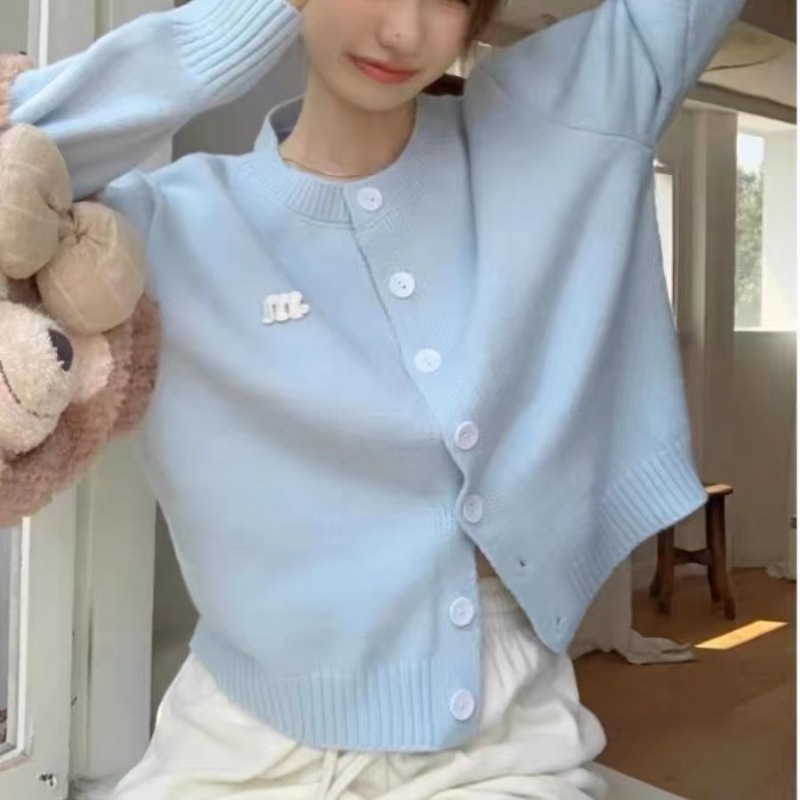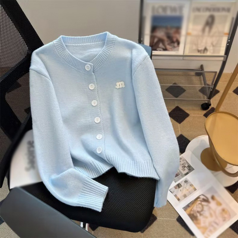 | nameOriginal | Cashmere light blue Long Sleeve Knitted Sweater Women's 2024 Spring New Gentle Wind Soft Waxy M Letter Cardigan Jacket |