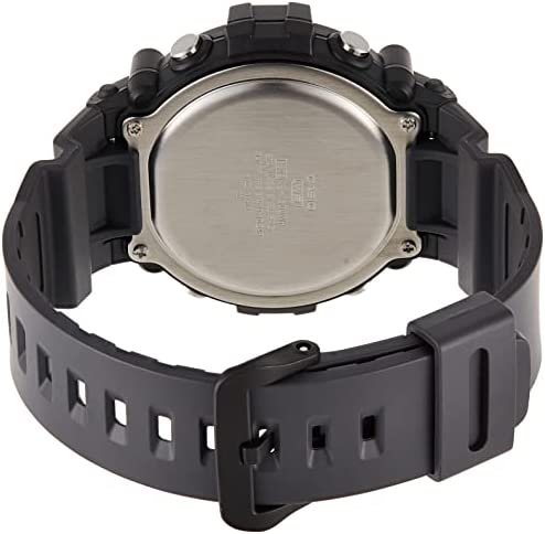 This product features a durable resin case and bezel, along with a comfortable resin band. The watch face is protected by a sturdy resin glass and is water-resistant up to 100 meters. The watch measures 54.4×51.2×15.7mm and weighs 57g. It includes 5 multi-function alarms with a snooze alarm, an hourly time signal, and a full auto-calendar up to the year 2099. The watch can display time in both 12 and 24-hour formats and includes regular timekeeping for hours, minutes, seconds, pm, month, date, and day.