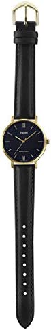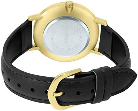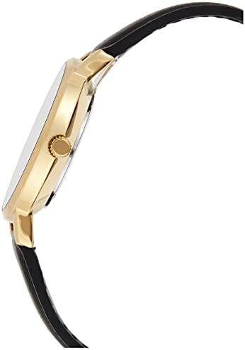 This watch features a stylish gold tone case and bezel that is ion plated for added durability. The leather band is comfortable to wear and complements the overall design of the watch. The mineral glass protects the watch face from scratches and damage. It is water resistant, making it suitable for everyday wear. The watch displays regular timekeeping with three hands for hours, minutes, and seconds. It has an accuracy of ±20 seconds per month and a battery life of approximately three years on SR626SW.
