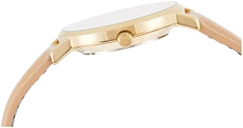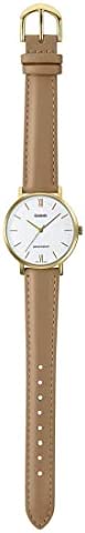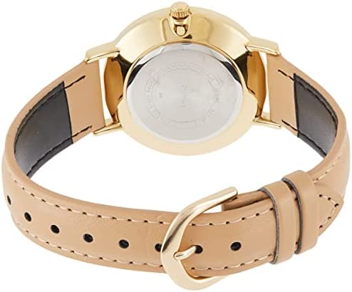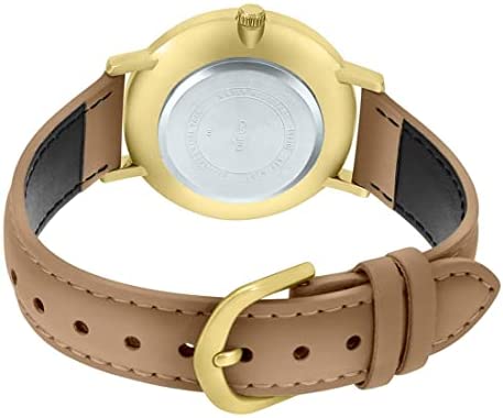 This watch features a stylish gold tone case and bezel that is ion plated for added durability. The leather band is comfortable to wear and complements the overall design of the watch. The mineral glass protects the watch face from scratches and damage. It is water resistant, making it suitable for everyday wear. The watch displays regular timekeeping with three hands for hours, minutes, and seconds. It has an accuracy of ±20 seconds per month and a battery life of approximately three years on SR626SW.