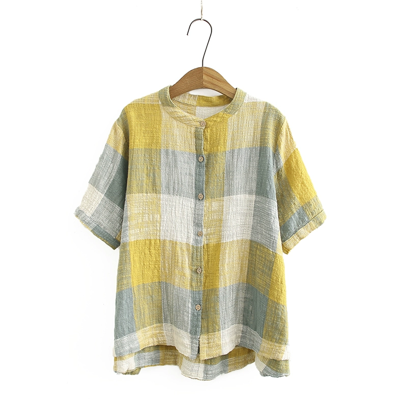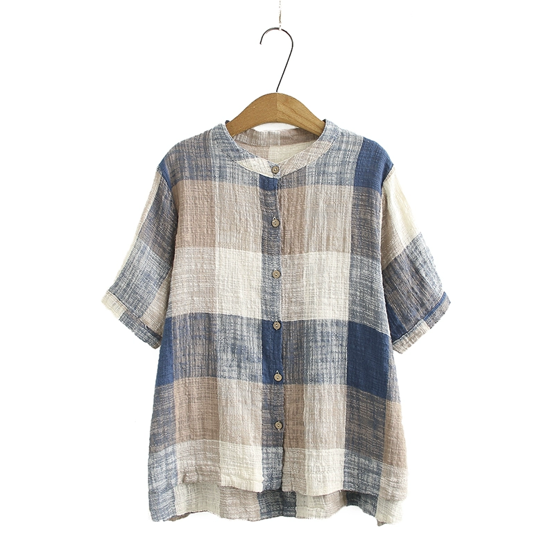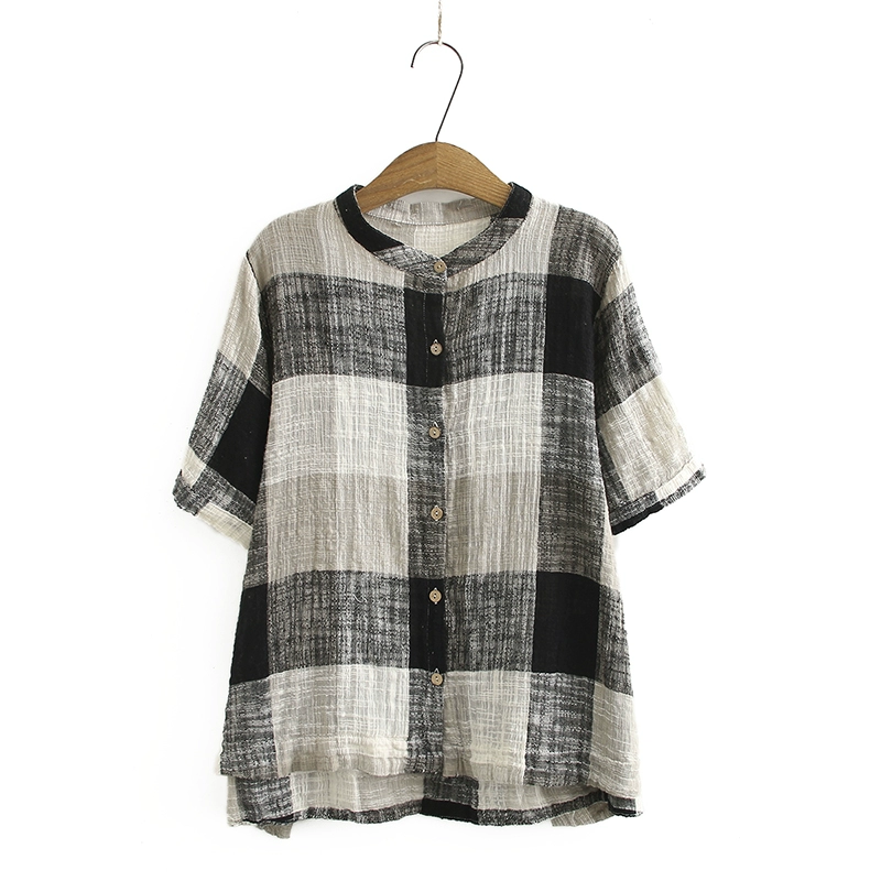 | nameOriginal | Casual fat girl large plaid stand collar cotton and linen short-sleeved summer dress |