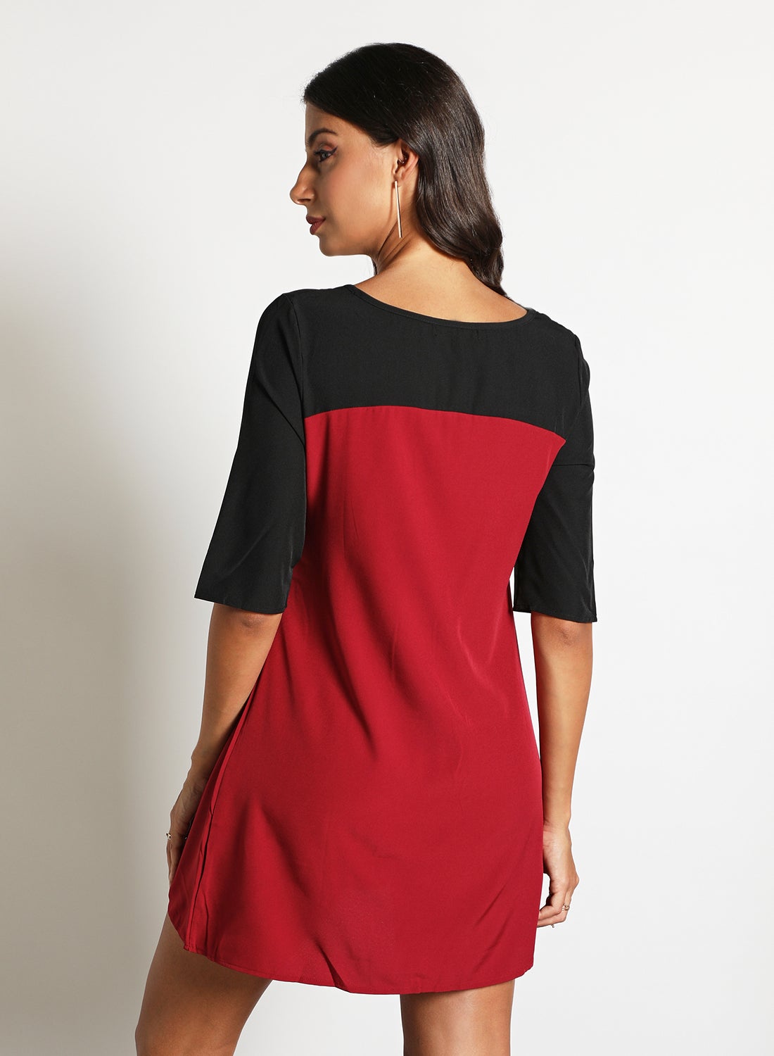 Casual Knee-Length Dress with Half Sleeves and Black/Wine Red Contrast for Women.