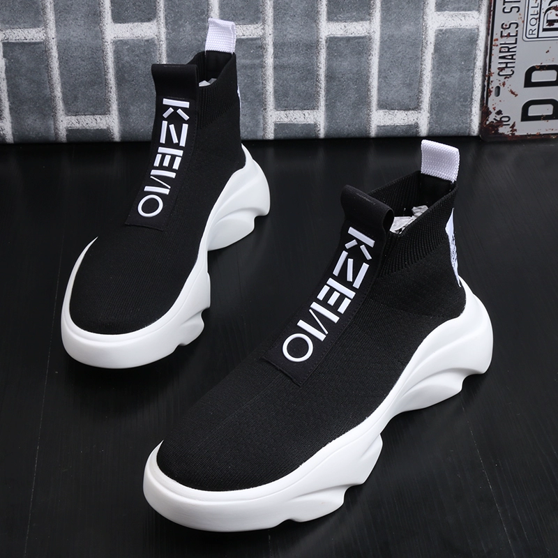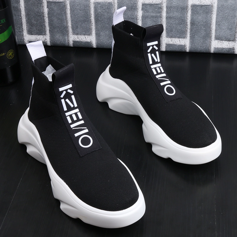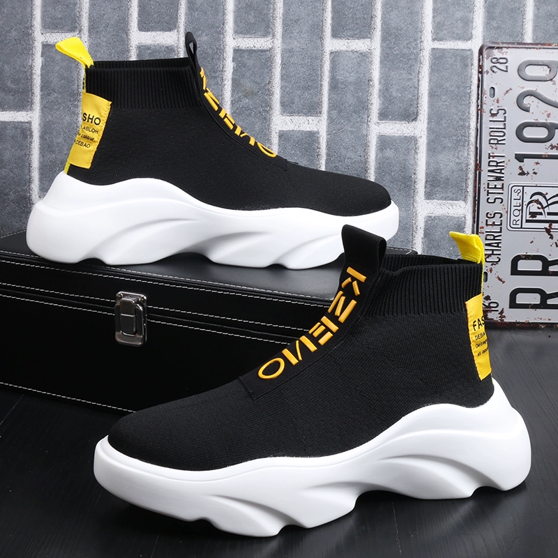 Casual men's high-top fly knit shoes mesh breathable knitted socks shoes British youth short boots thick soles with increased height