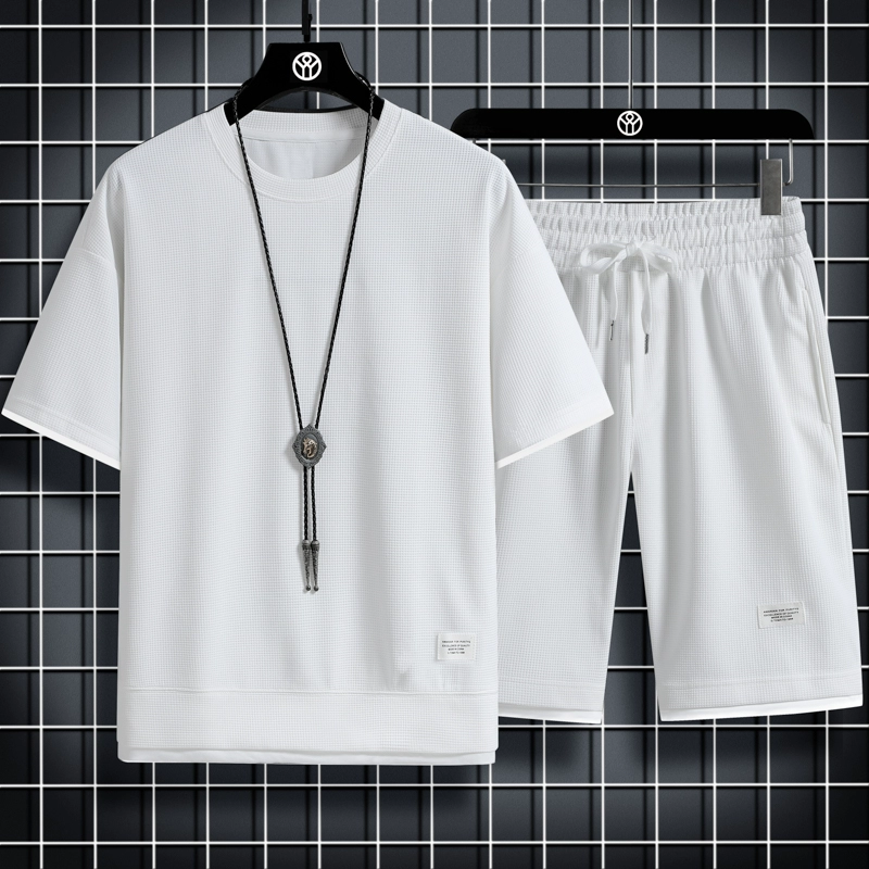 Leisure sports set Men’s summer thin fake two short -sleeved T -shirt shorts with a set of tide card loose