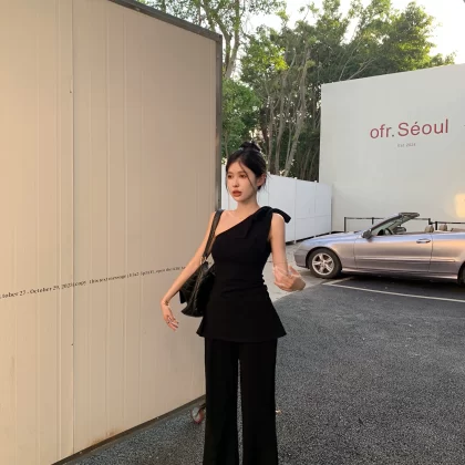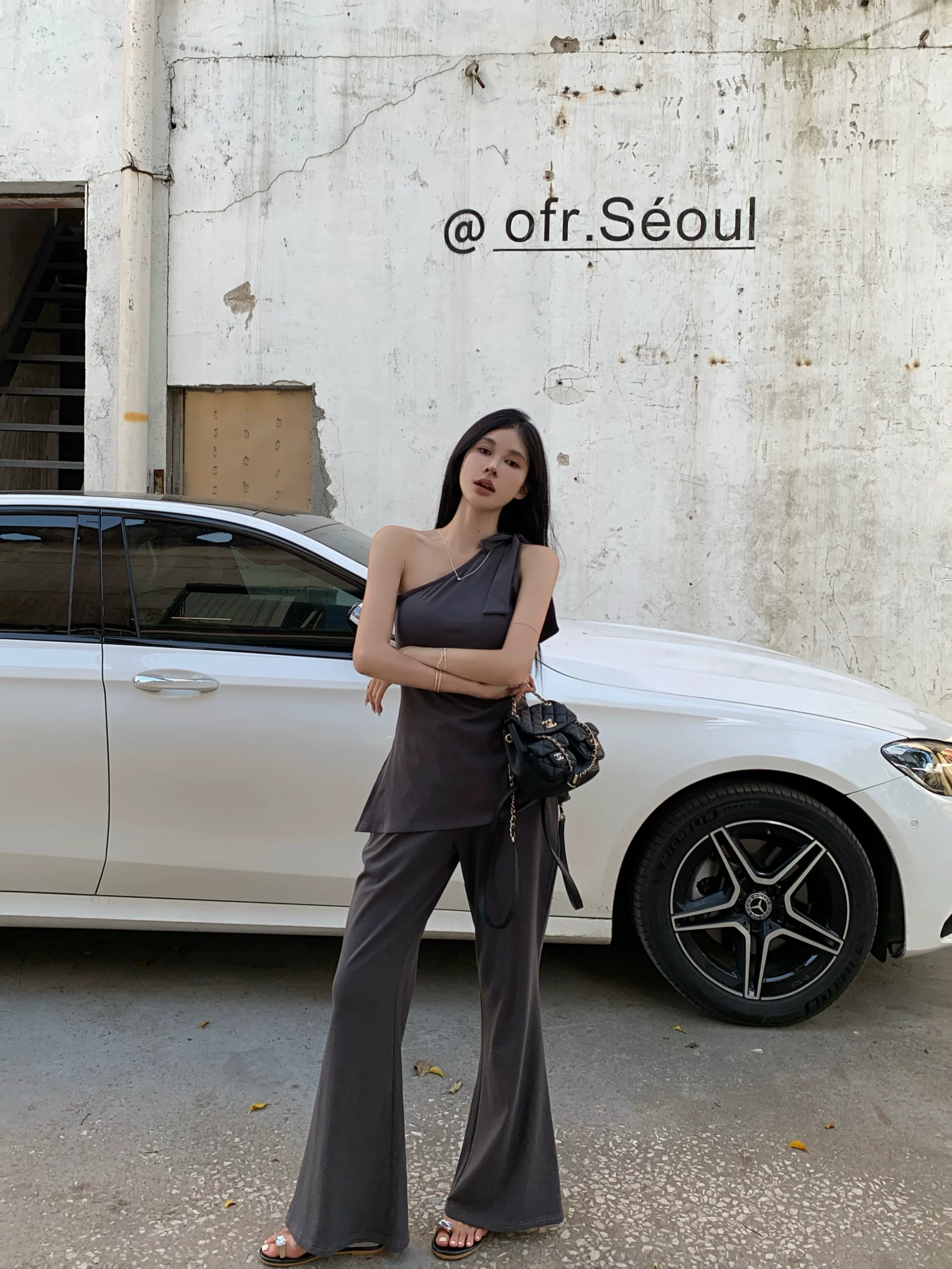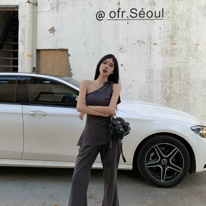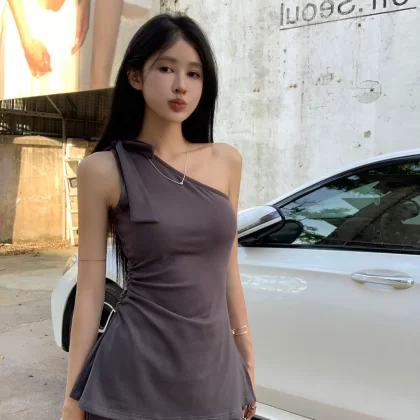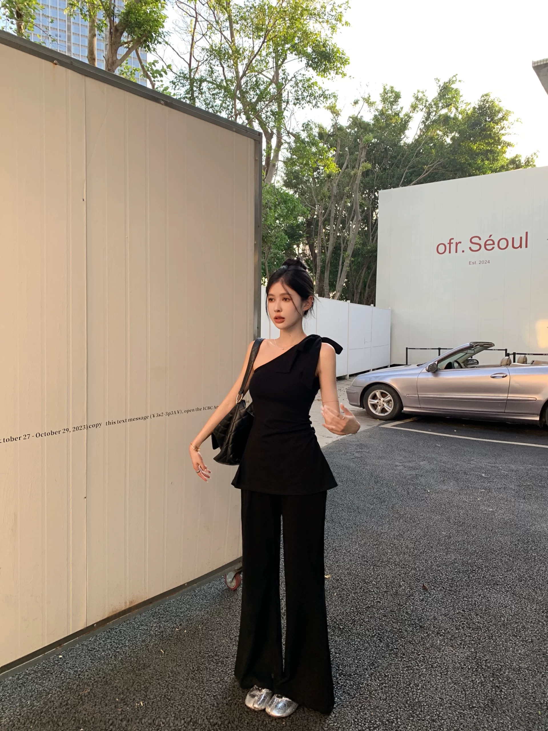 Casual style slanted shoulder sleeveless straight micro-flare vest