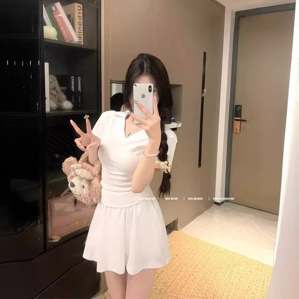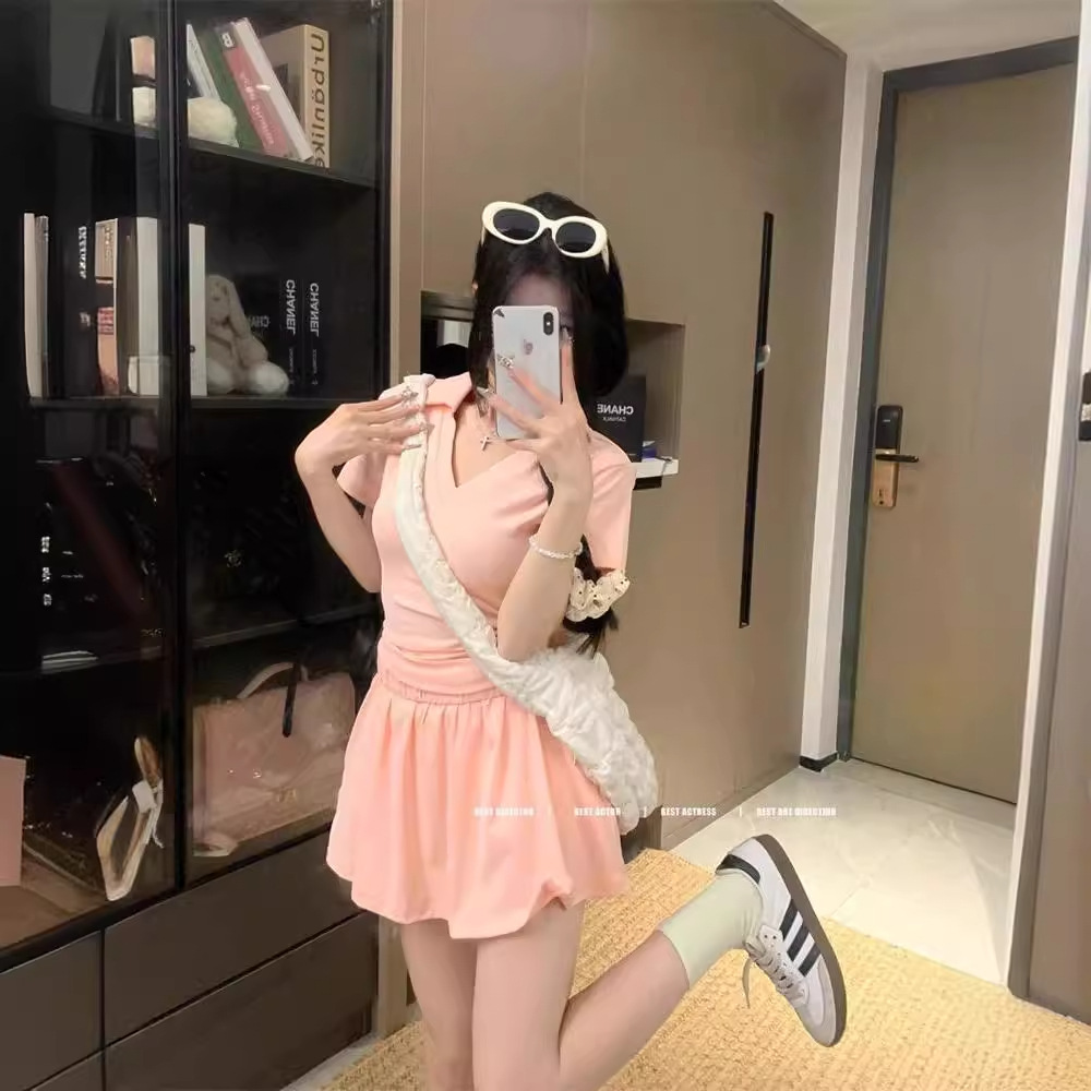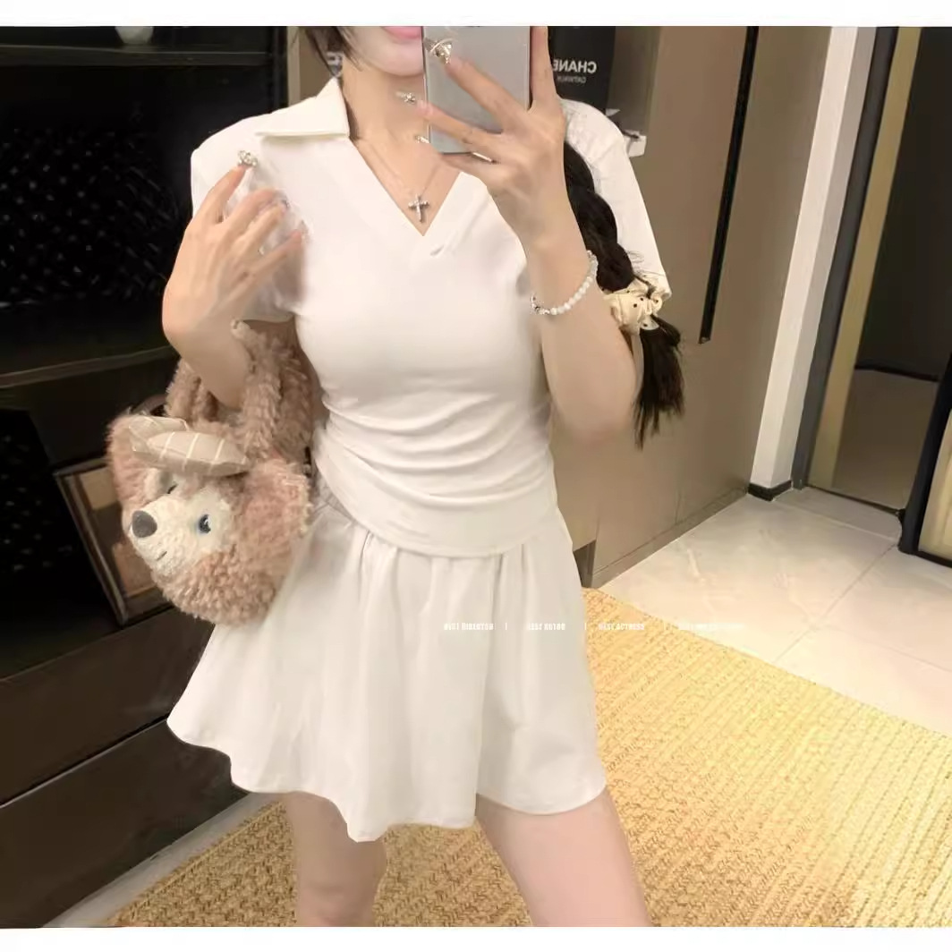 | nameOriginal | Casual Style suit Women's Summer New Solid Color V-neck Pleated Short-sleeved T-shirt High Waist A- line Skirt Two-piece Set Trendy |