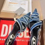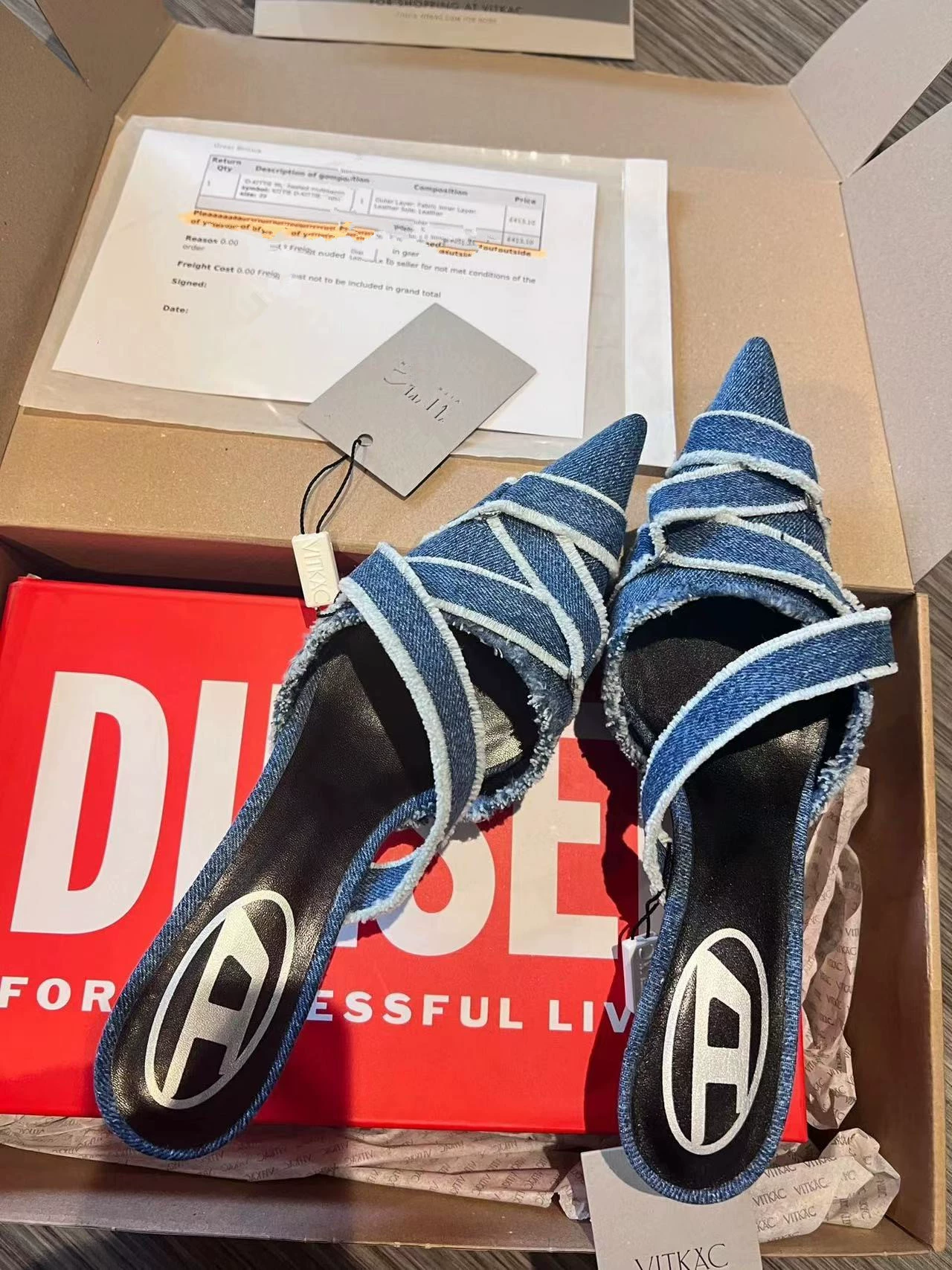 | nameOriginal | Cat heel letter retro denim color empty back half slippers |