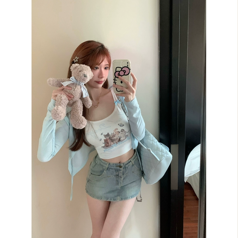 Cat print slim fit bow tank top with suspenders