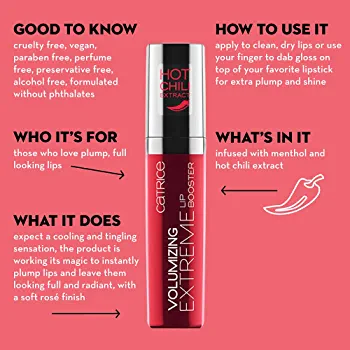 | descriptionOriginal | Volumizing Lip Booster Extreme Plump em’ up! Infused with menthol and hot chili extract, the Catrice Volumizing Extreme Lip Booster will Take your lip game to the extreme! Instant Volume! This vegan Lip Booster instantly plumps lips. Expect a cooling and tingling sensation after application, the product is working its magic! Your Lips but Better! The formula enhances lip volume and natural color without the sticky feeling. Apply with the precise applicator to leave lips looking full and radiant with a soft rose finish. |