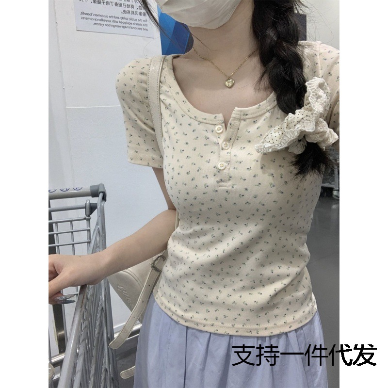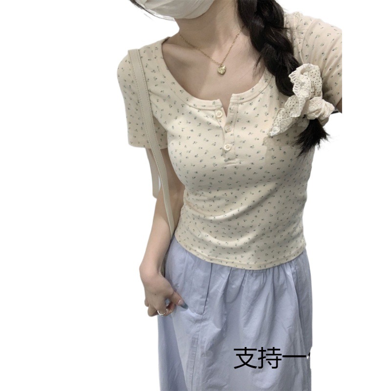 CD Button Half-open Collar Small Floral Shoulder Shirt Women's 2024 Summer Sweet Age-reducing Collar Short-sleeved Short Top