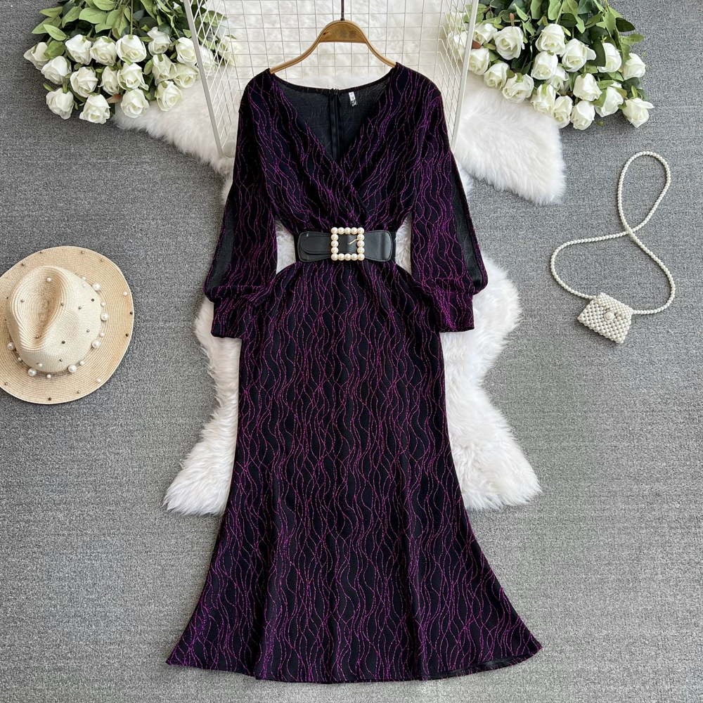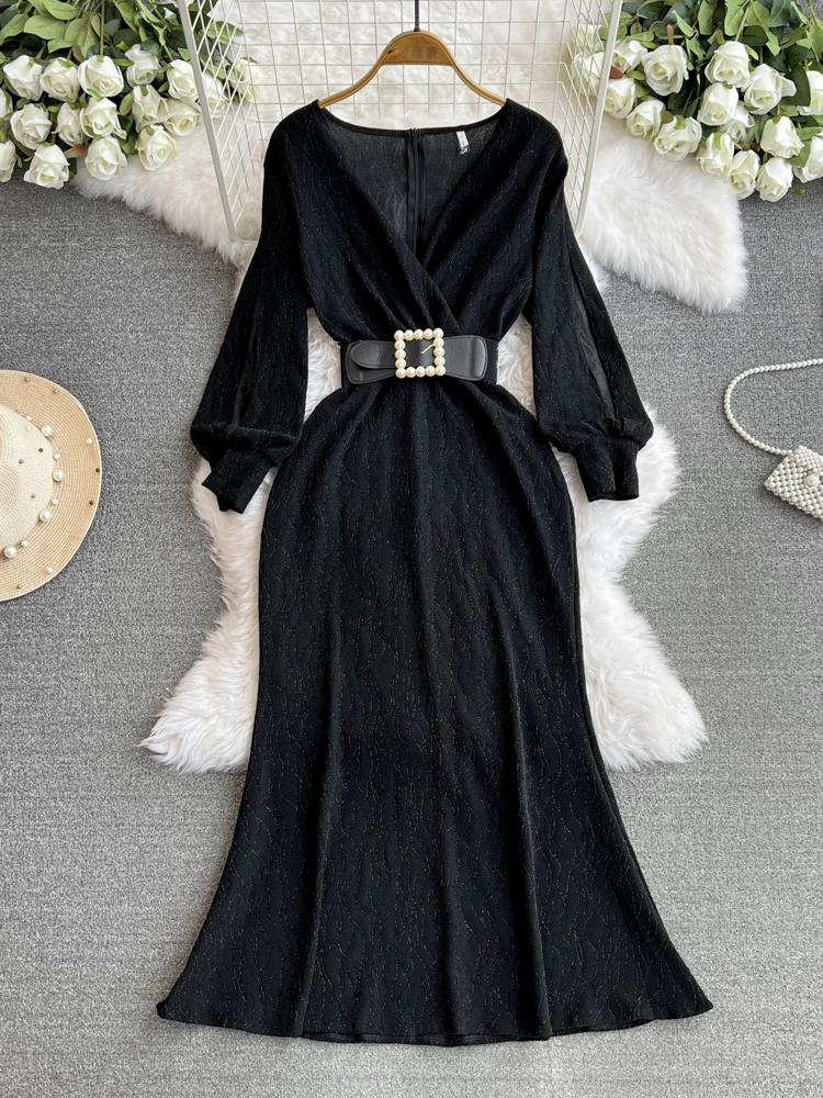 Celebrity light luxury high-end evening dress, elegant V-neck waist, slimming bright silk dress, Hepburn French long skirt