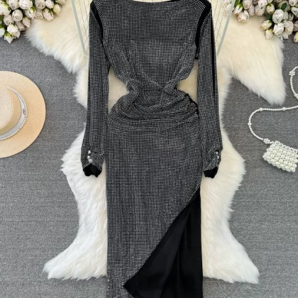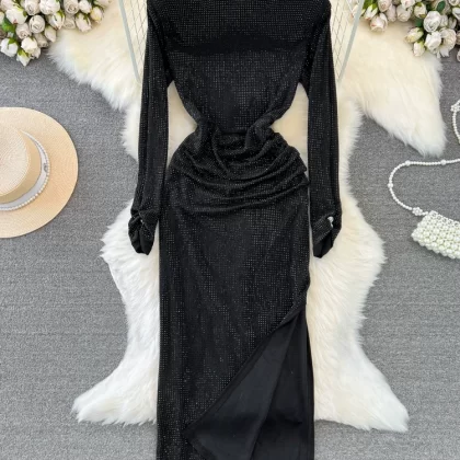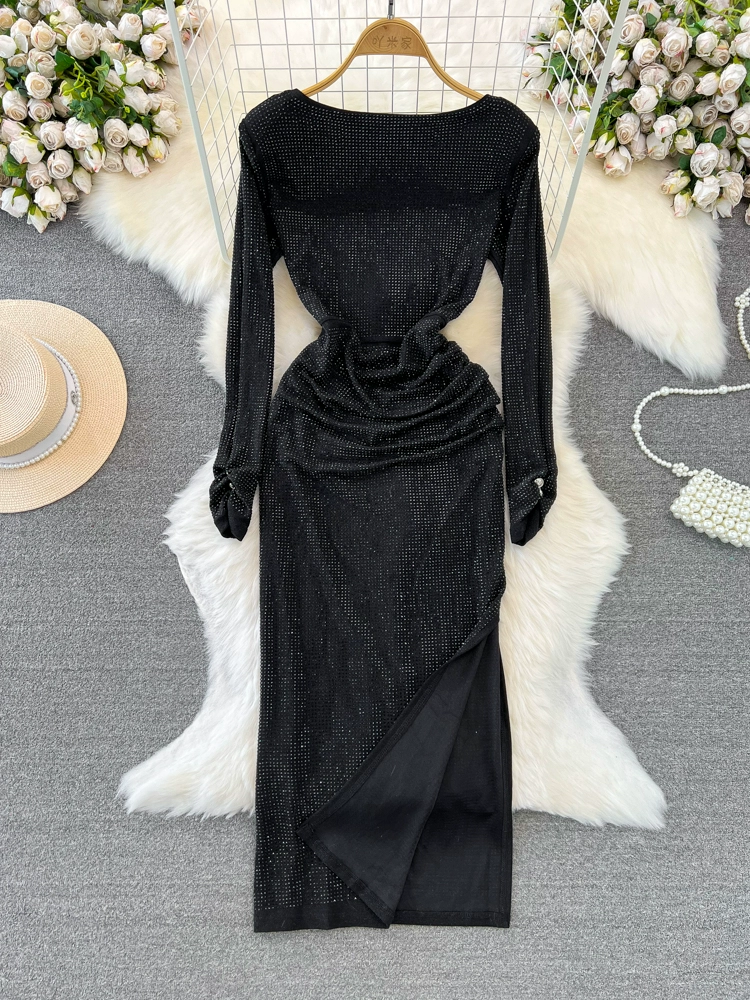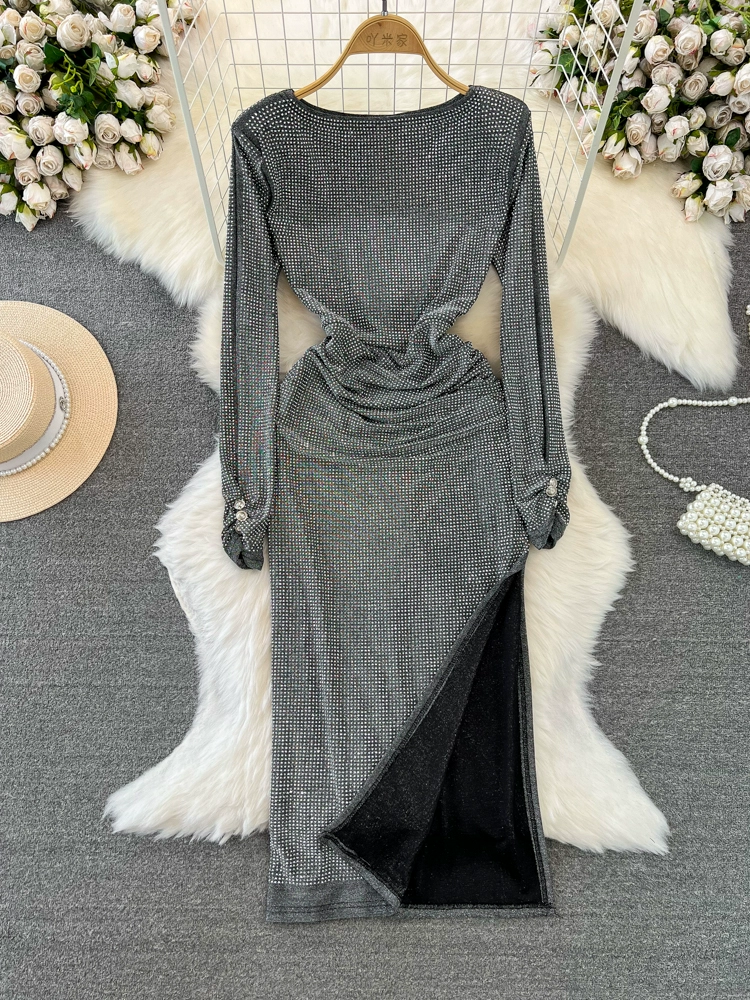 | nameOriginal | Celebrity long-sleeved round neck sparkling dress with hot diamonds |
