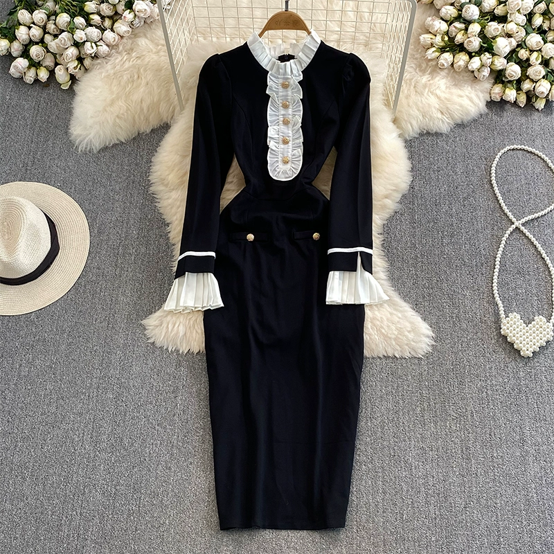 | nameOriginal | Celebrity trumpet long-sleeved contrast color stand-up collar dress |