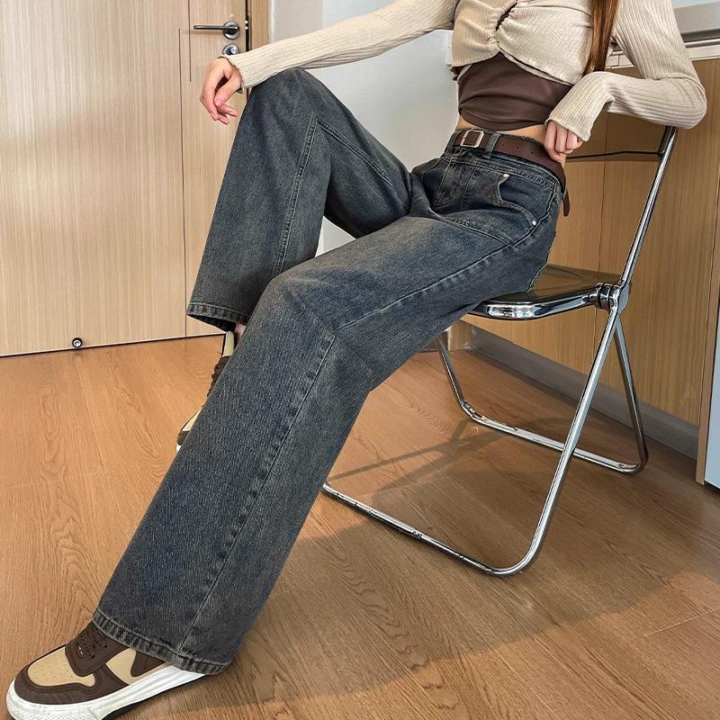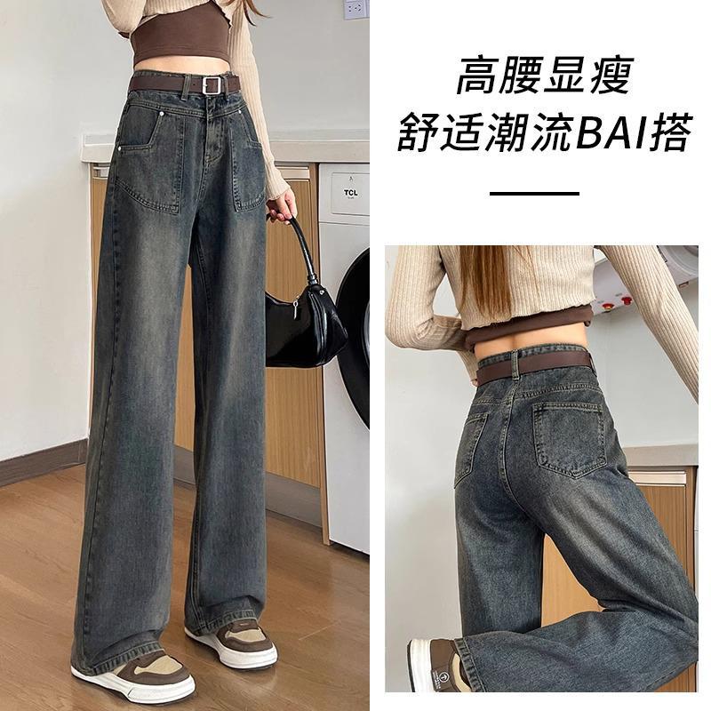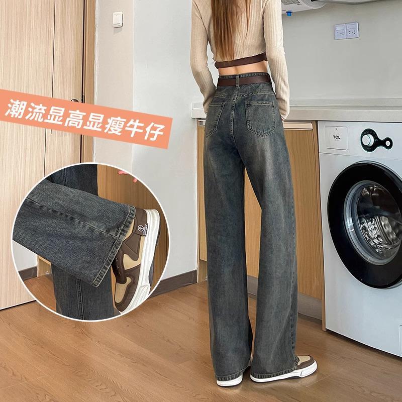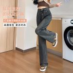Cement gray straight jeans women’s 2023 autumn and winter New High waist wide leg pants women’s loose slimming narrow mop pants