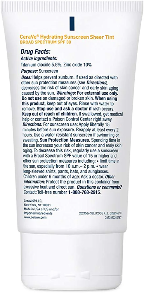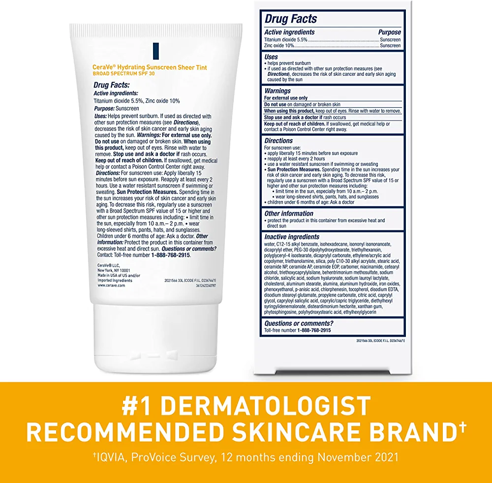 CeraVe Hydrating Sunscreen Sheer Tint lotion is a product designed in collaboration with dermatologists to provide broad-spectrum protection of SPF 30. It contains 100% mineral filter sunscreen that creates a protective film on the skin’s surface to reflect UVB and UVA rays. The lotion is non-greasy and instantly leaves the skin with a healthy glow without any white-cast. It is formulated with three essential ceramides that help restore the skin’s natural barrier and lock in moisture, providing all-day hydration.
