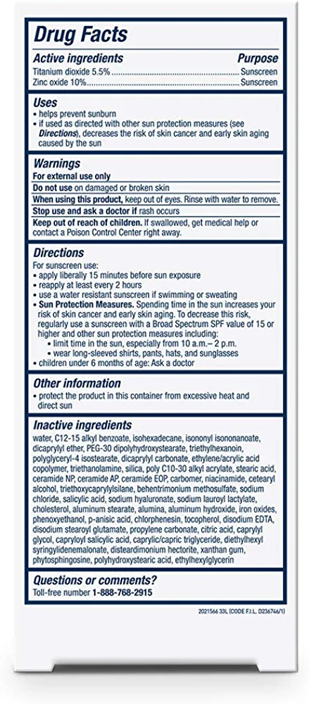 This sunscreen is allergy tested, fragrance-free, paraben-free, oil-free, non-comedogenic, and gentle on the skin. It is also recommended by the Skin Cancer Foundation. The key ingredients include 100% mineral sunscreen filters, zinc oxide, and titanium dioxide that reflect the sun’s rays. It does not contain oxybenzone or avobenzone. Ceramides are also present, which are essential for healthy skin and help restore and maintain the skin’s natural barrier. Hyaluronic acid is another ingredient that attracts hydration to the skin’s surface and helps the skin retain moisture.