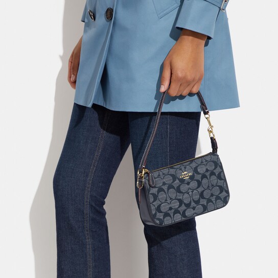This product features a unique combination of chambray and smooth leather, and includes two slots for credit cards and a multifunctional pocket on the inside. It also has a zip-top closure with fabric lining, and a handle with a 6 1/4″ drop. The dimensions of the product are 7 1/2″ (L) x 4 1/2″ (H) x 2″ (W), and it is identified by the style number CH149.