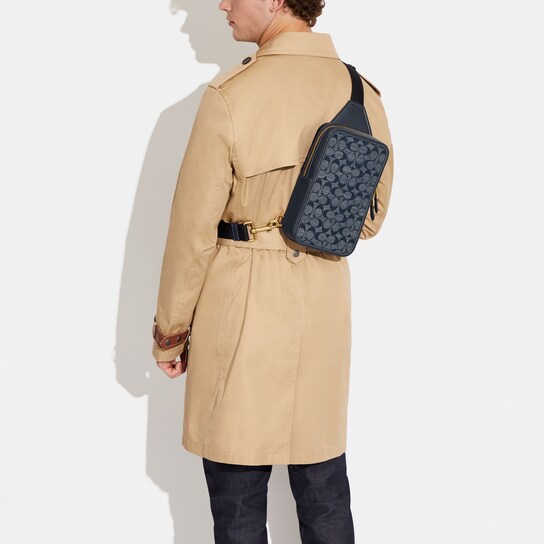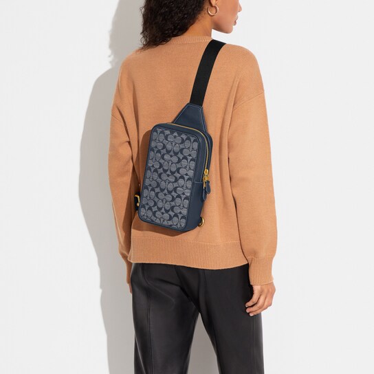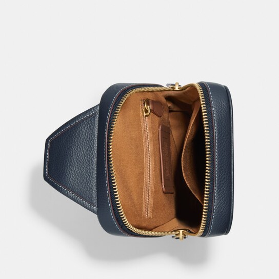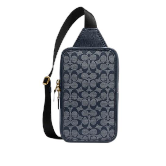 This product features a combination of chambray and pebble leather, with convenient interior zip and multifunction pockets. It has a secure zip closure and is lined with fabric. The shoulder strap is adjustable for comfortable crossbody wear, and can be clipped to either the left or right side. The dimensions of the product are 6 1/4″ in length, 10 1/2″ in height, and 2 1/4″ in width. Its style number is CG993.