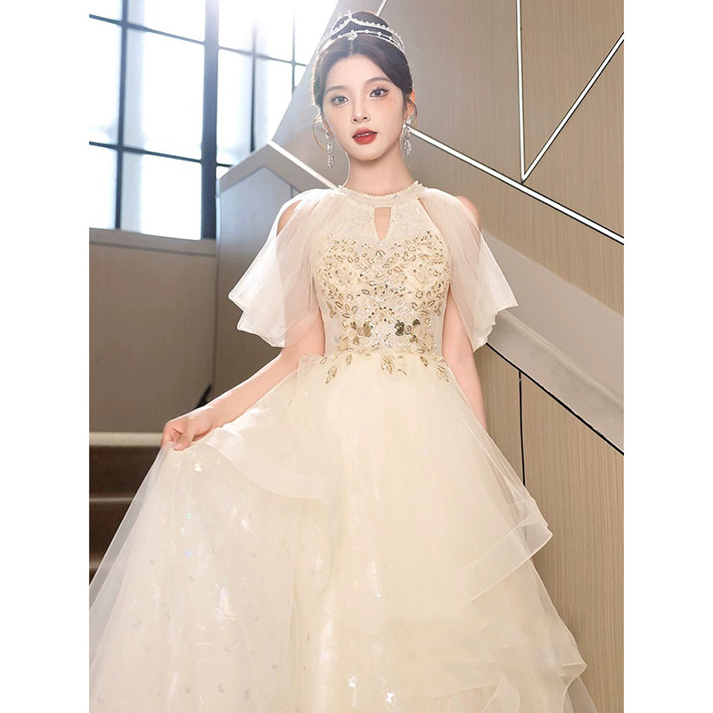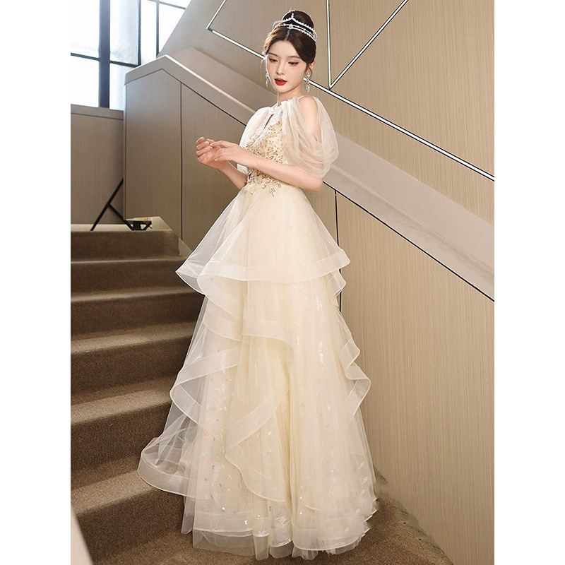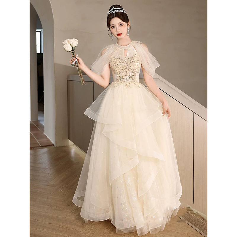 | nameOriginal | Champagne evening dress for women 2024 New halter high-grade light luxury niche high-end art exam dress banquet host |