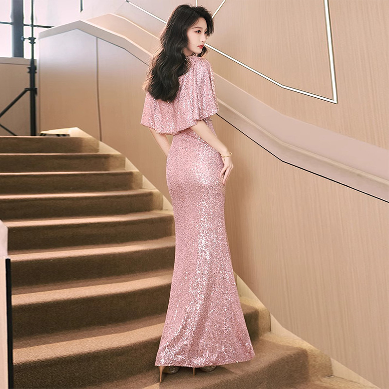 Champagne Gold evening dress plus size sequined short sleeve host annual meeting birthday bridesmaid dress piano playing fishtail dress
