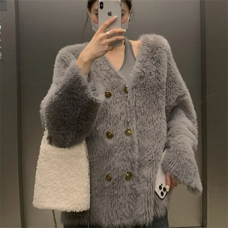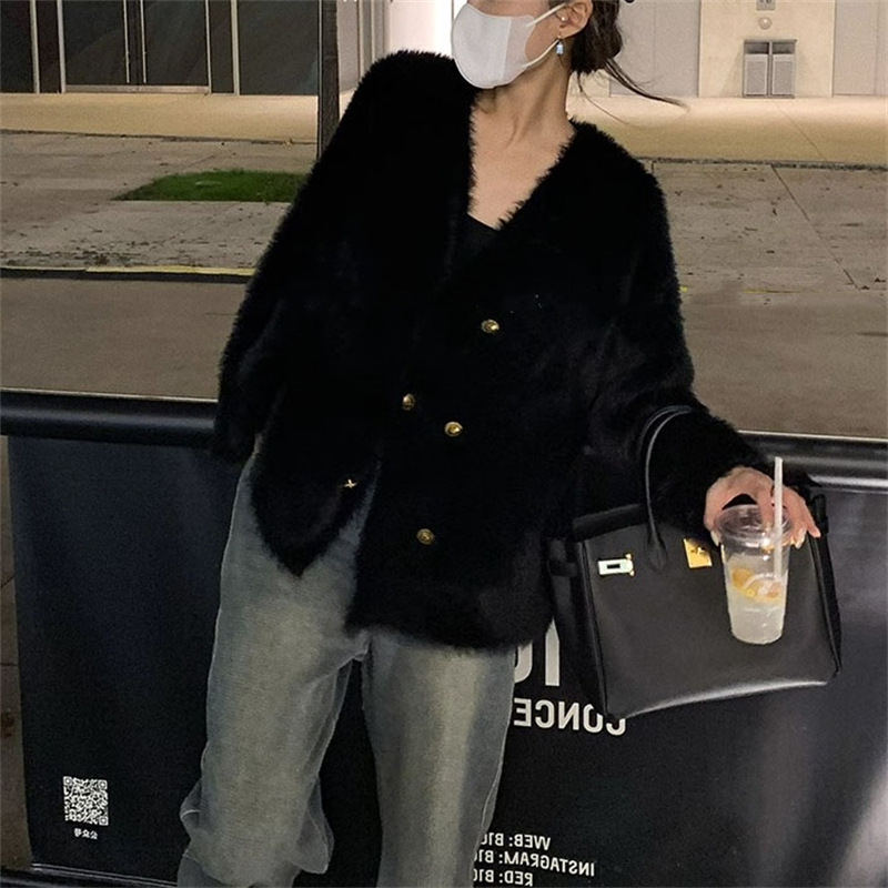 Chanel style double breasted sweater women's coat women's autumn and winter New light luxury faux mink fur V-neck knitted cardigan women