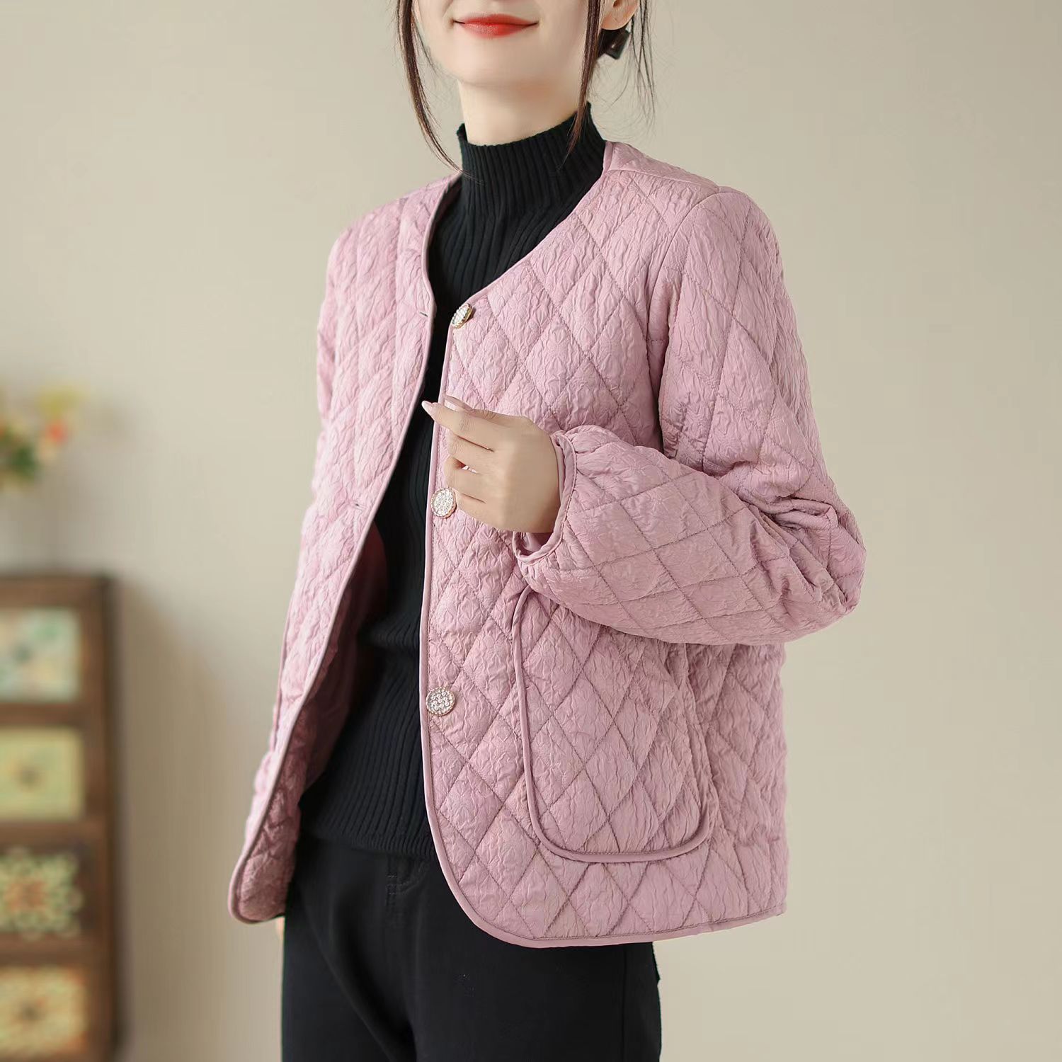 Chanel style gentle diamond-shaped plaid long-sleeved cotton-padded coat for women autumn and winter New versatile Western style short coat loose creamy-white