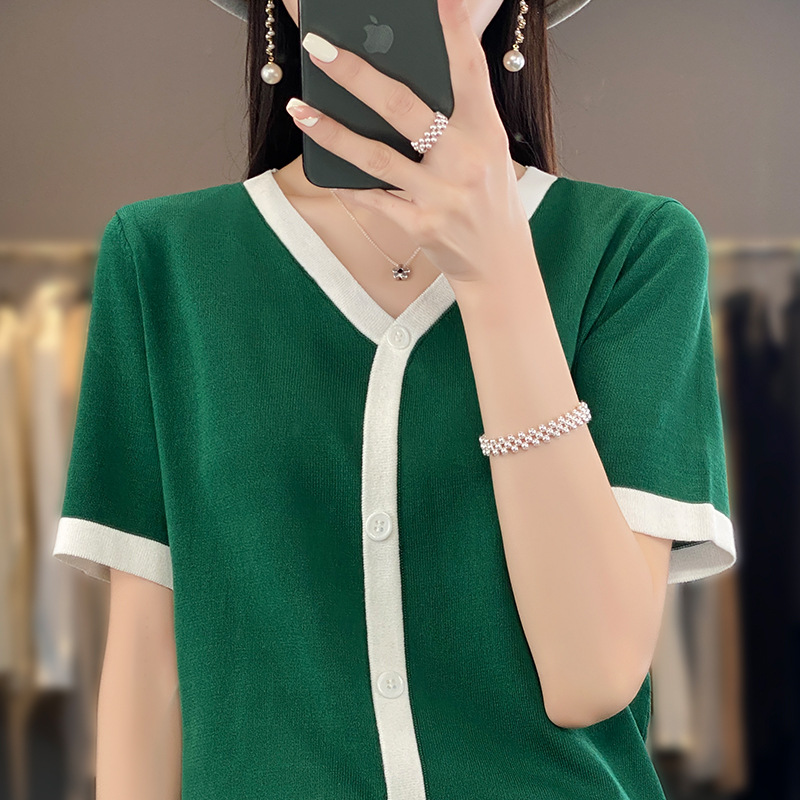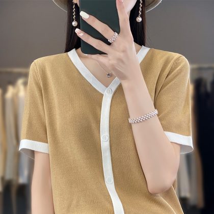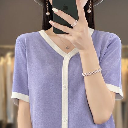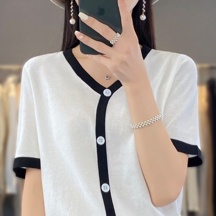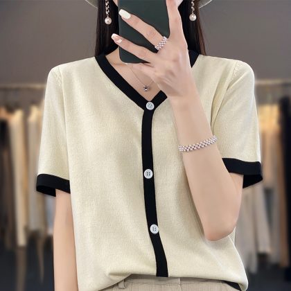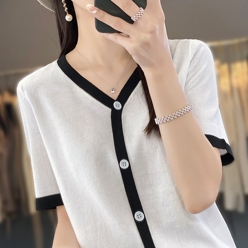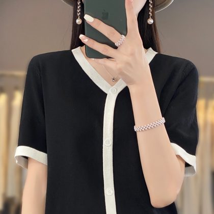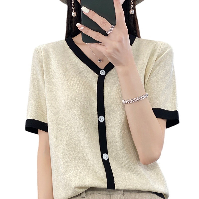 | nameOriginal | Chanel Style Ice Silk Fake Cardigan Short-sleeved Women's 2024 New Summer Thin Knitted V-neck Color Matching Cardigan Short-sleeved |