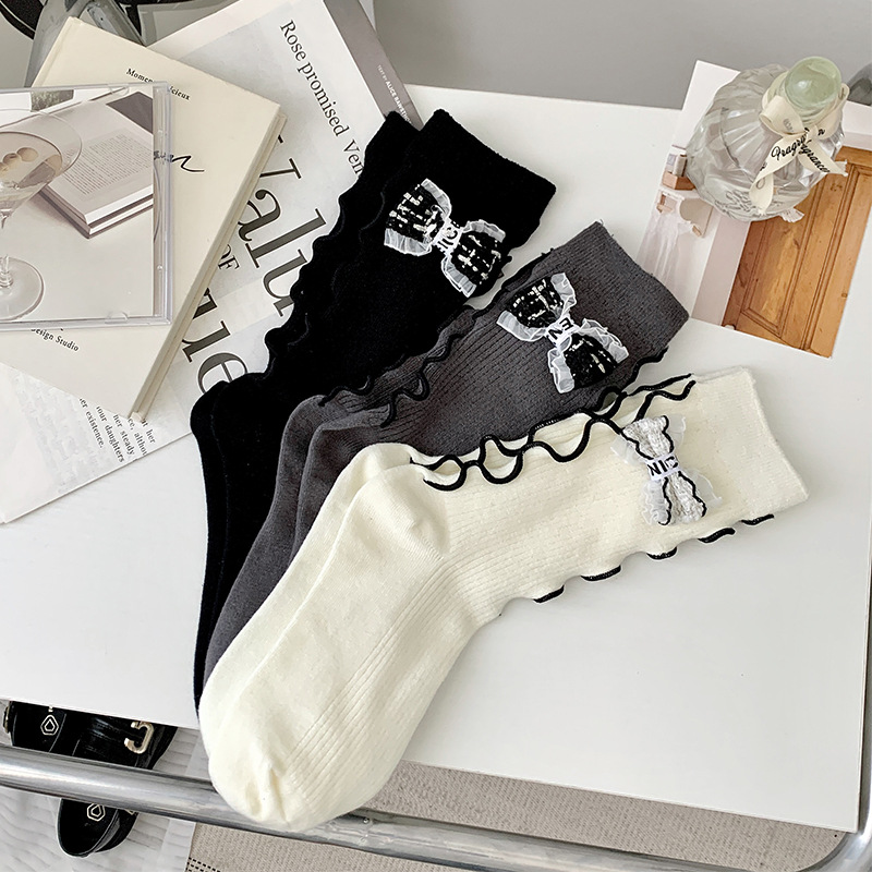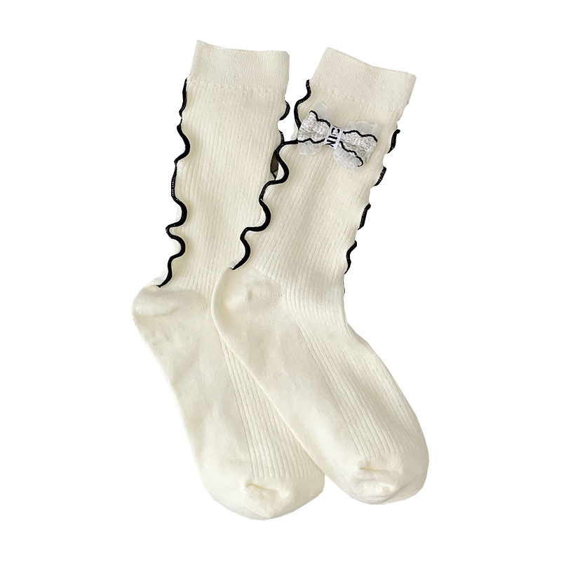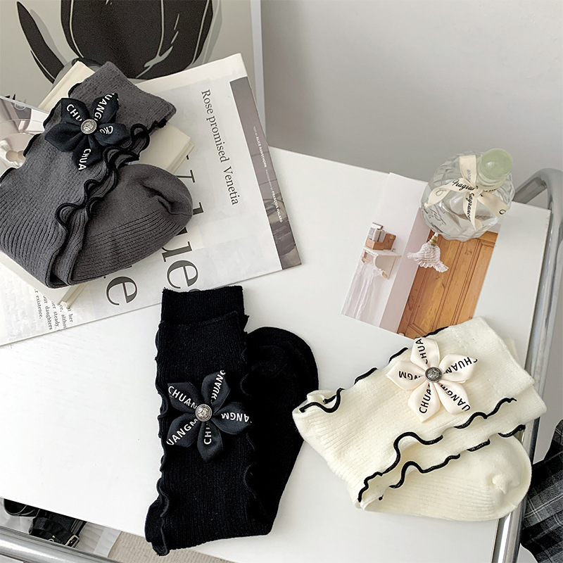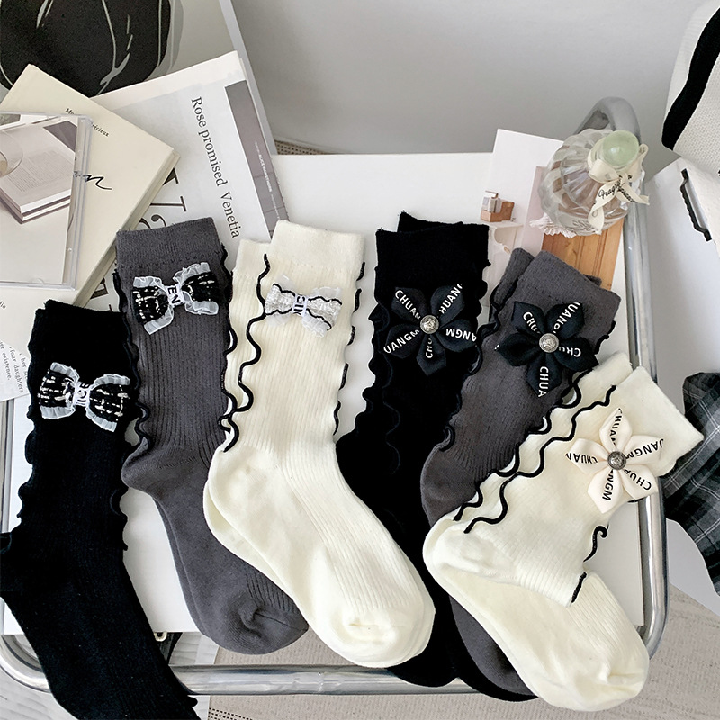 Chanel style light luxury bowknot flower socks for women Spring and Autumn niche personality wooden ear Japanese JK pile stockings