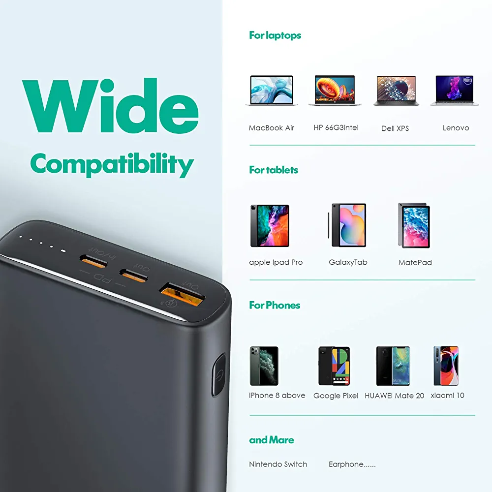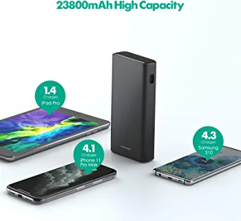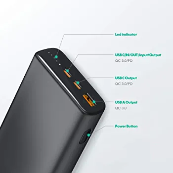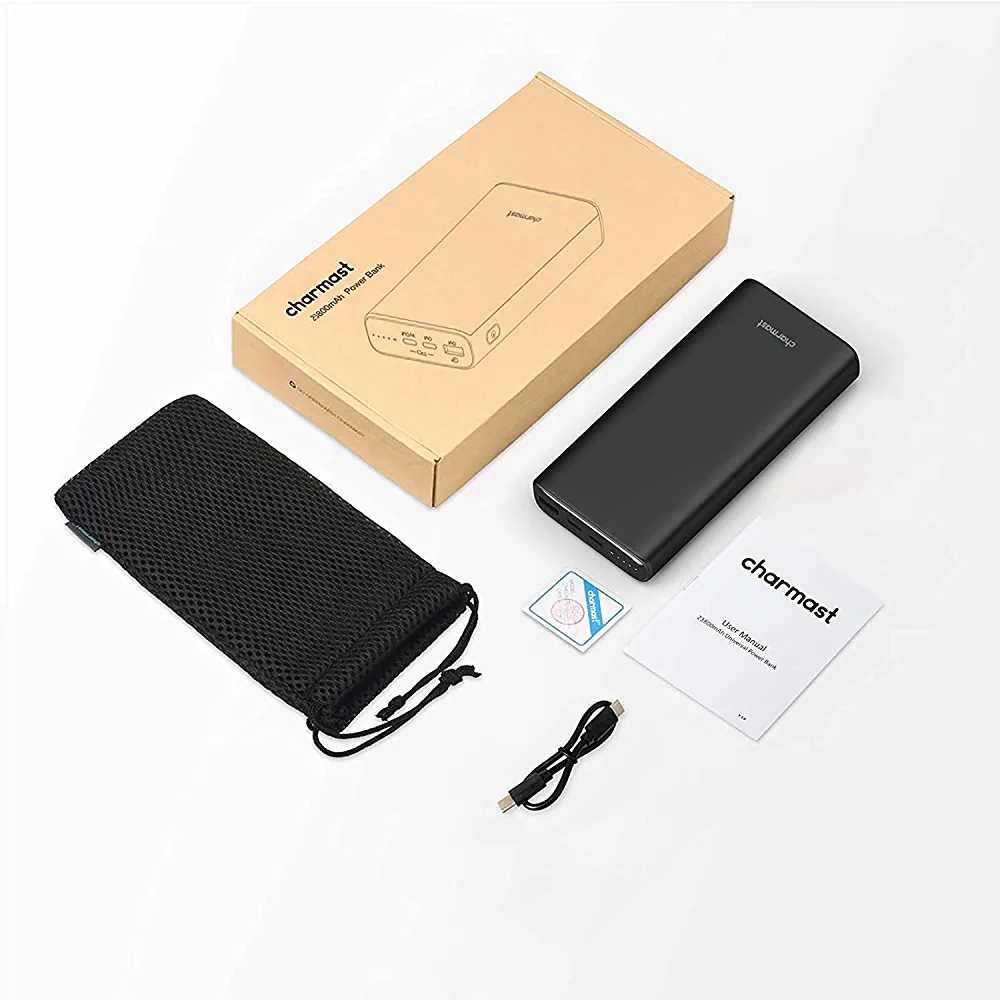 USB C/A Output 18W max. When you need power on the go, the Charmast 65W 23800mAh Power Bank – USB-C, 65Wh, can charge the widest range of laptops and devices with a high 65W power delivery. Whether you need to charge devices with voltage profiles of 5V, 9V, 15V or 20V, this 65W Power Bank has you covered. All outports support 18W fast charging for various mobile devices, and charging speed is 4 times faster than some traditional battery banks in the markets. This power bank can only be recharged in through the USB-C port that has an “Input” label. We recommend that you use a 45W Power Delivery wall charger to recharge this power bank with as it’s able to recharge the fastest that way just in 2 hours around. Other options for recharging: ●appr 6 hours (by QC 3.0/PD 3.0/Samsung AFC/MTK-PE 2.0/Huawei FCP Power adapters) ●appr 11 hours (by 5V/2A Power adapter) Input: USB C(In/Out)5V-20V (Max 45W) Output: USB C(In/Out)5V-3A 9V-3A 12V-3A 15V-3A 20V-3.25A (Max 65W) (the middle one)USB C( only Out)5-6V-3A 6-9V-2A 9-12V-1.5A USB A 5-6V-3A 6-9V-2A 9-12V-1.5A ●All three USB ports are on the front. From right to left you have USB-A, USB-C Out, USB-C In/Out, LEDs, and power button. ●4 mini Led indicators in the side part to keep you informed how much power it left. Each dot presents 25% capacity. ●If the Led light in orange that means Quick charge mode on. And if the led turns to green, that means the low current charging mode is on. The charger has a length of 6.4 inches, a width of 3.4 inches, and a thickness of 1.1 inches. The weight of the power bank is 1.3 pounds.It is a pocketable power bank, it’s perfectly to just hold it in your hand or place it in a bag. Package Contents 1 x 23800mAh Universal Power Bank 1 x USB C to USB C Cable 1 x User Manual 1 x Mesh Pouch Low Charge Charging Mode Low current charging (trickle charge) mode is for low power devices. Such as a Fitbit or wireless earbuds. These small accessories draw little current (<60mA). So much so a power bank thinks charging is complete, and shutdowns to save power. This means a low power draw device could get only minutes of charging. Trickle charge mode corrects for this, by forcing the power bank to stay on for a couple of hours. Allowing small accessories time to charge. Multiple Protection System The integrated over-charging protection ensures that the Power bank stops the charge process automatically once charging has been successfully completed. The deep discharge protection switches the Power bank off as soon as the voltage of the Power bank drops below a defined value when charging the connected device, thus preventing damage to both the rechargeable battery and the product. The short-circuit protection completes the safety functions and ensures maximum safety along with the automatic shut-off. Charmast Power Bank 65W PD QC 3.0 Quick Charge Led Display Power Bank 23800mah PD QC 3.0 Quick Charge PD 18W Power Bank 26800mAh QC3.0 Small Power Bank 18W PD Quick Charge 10000mah wireles power bank